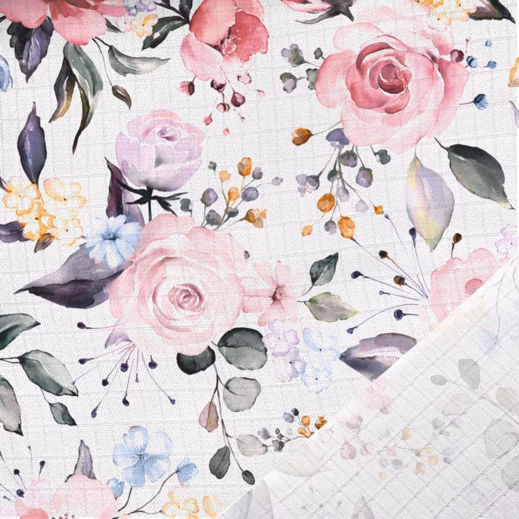 Ett supermjukt och tunt bambutyg med tryck av vackra rosor på vit botten. Passar perfekt för sömnad av lätta babyfiltar och swaddlefiltar.