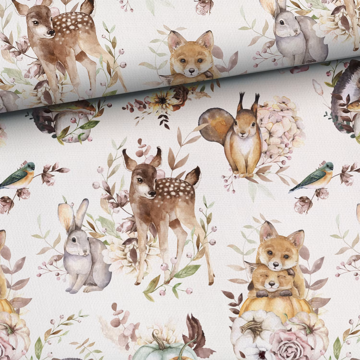 Ett vävt, lätt och supermjukt bambutyg med tryck av vackra djur och blommor på vit bakgrund.