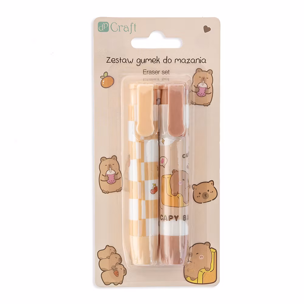 Tack vare den kompakta designen får suddpennorna enkelt plats i pennfodral, skrivbordslåda eller väska. Ett perfekt val för alla capybara-fans och för dig som vill ha både funktionella och söta skrivtillbehör.