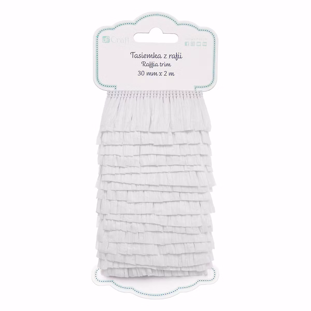 2 meter dekorativt raffiaband i vit färg. Perfekt för korttillverkning, scrapbooking, presentinslagning, heminredning och kreativa DIY-projekt.