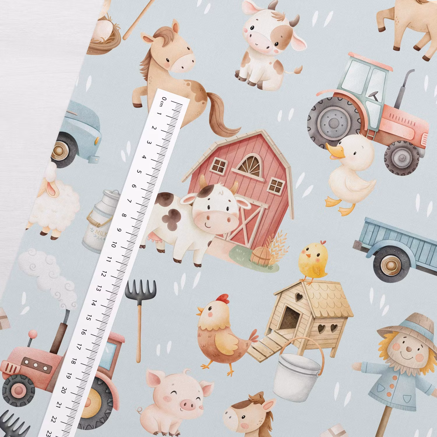 Ett mjukt, vävt bomullstyg med tryck av söta bondgårdsdjur och traktorer i ljusblått.