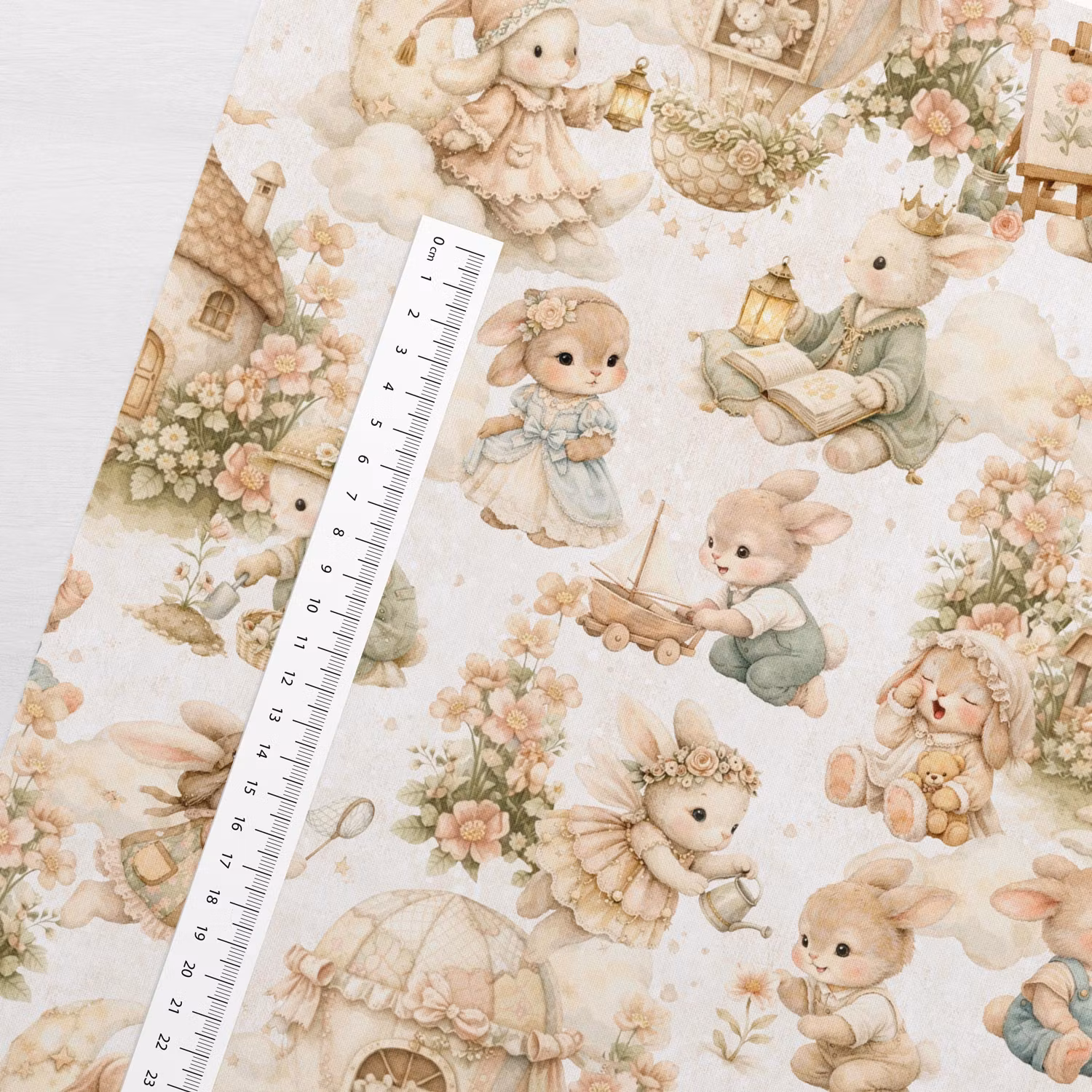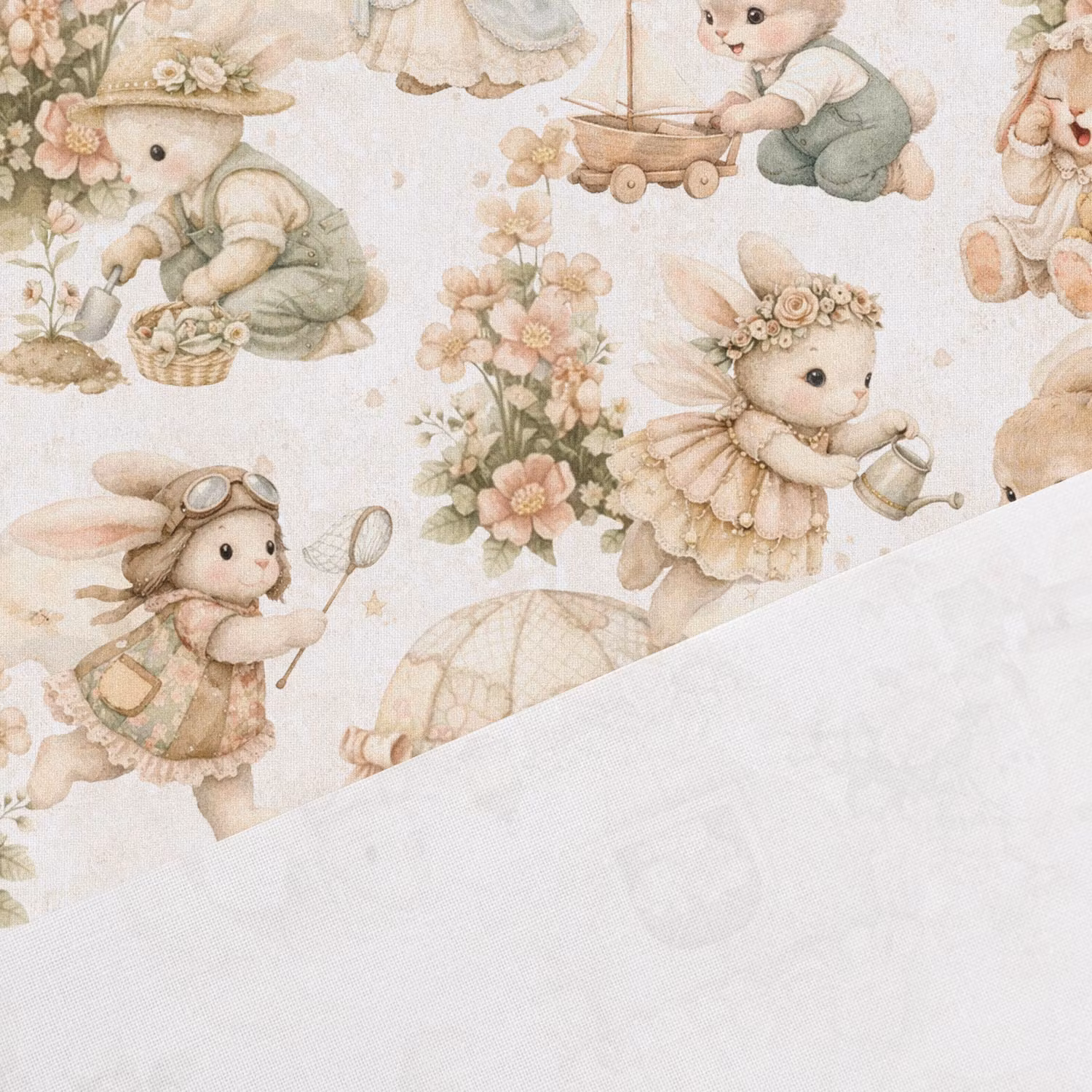 Ett mjukt, vävt bomullstyg med tryck av kaniner och blommor med vit bakgrund.