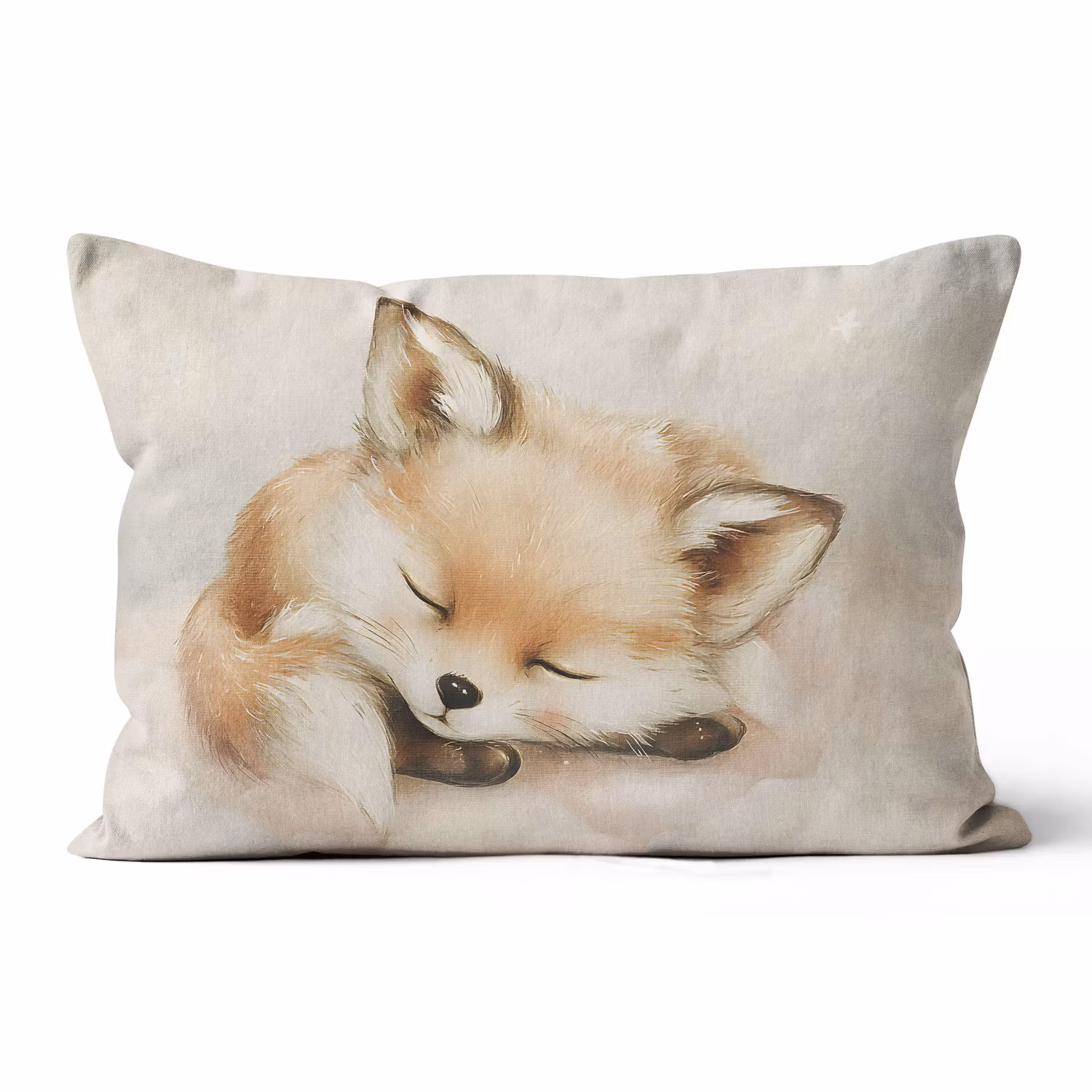 En 60 x 40 cm bit av mjukt, vävt bomullstyg med tryck av en sovande räv med beige bakgrund.