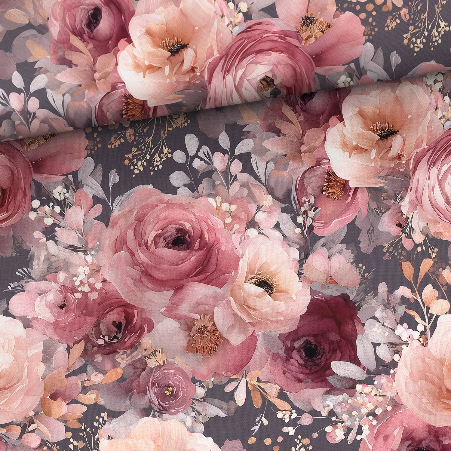 Ett mjukt, vävt bomullstyg med tryck av vackra rosor med grå bakgrund.