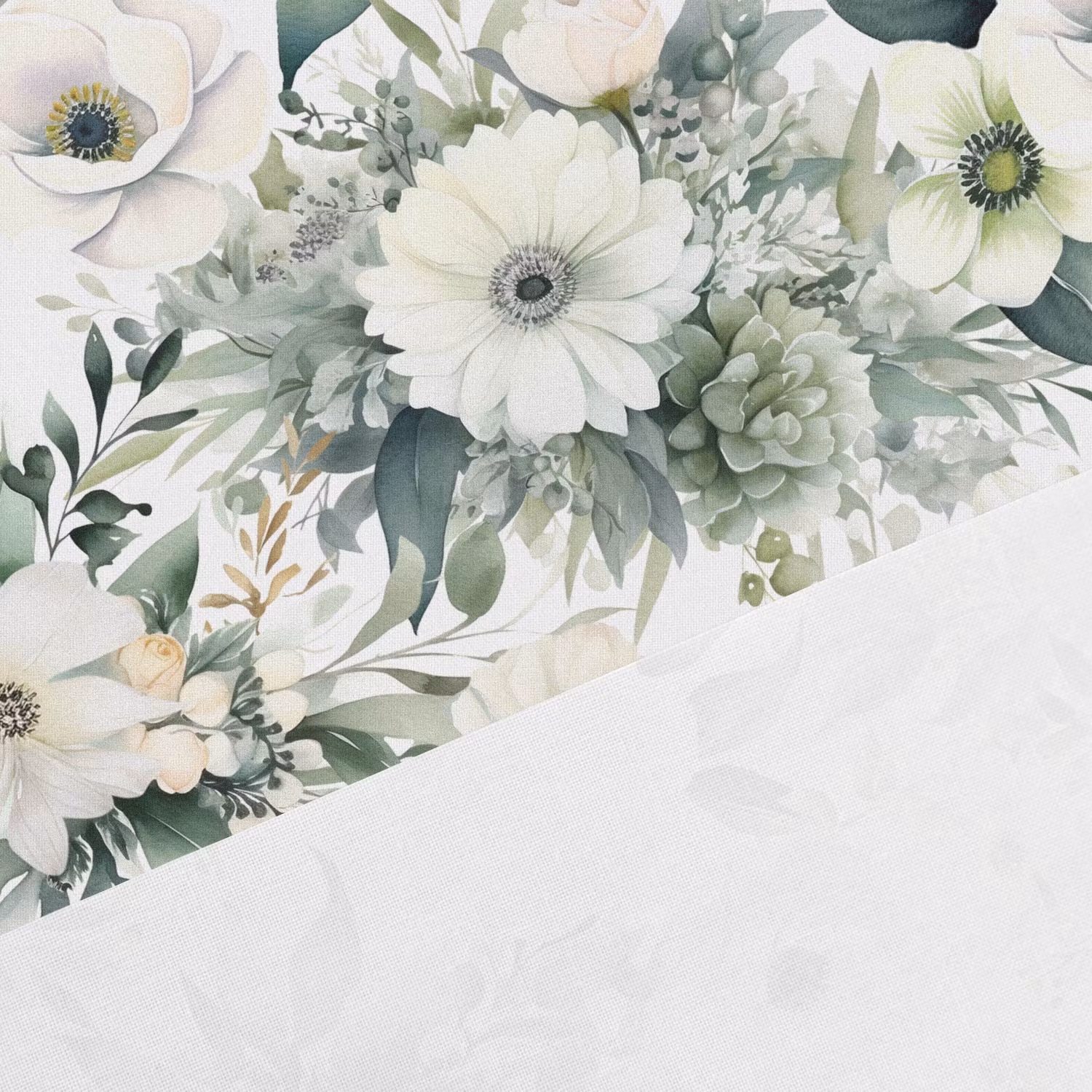 Ett mjukt, vävt bomullstyg med tryck av vackra, vita anemoner.