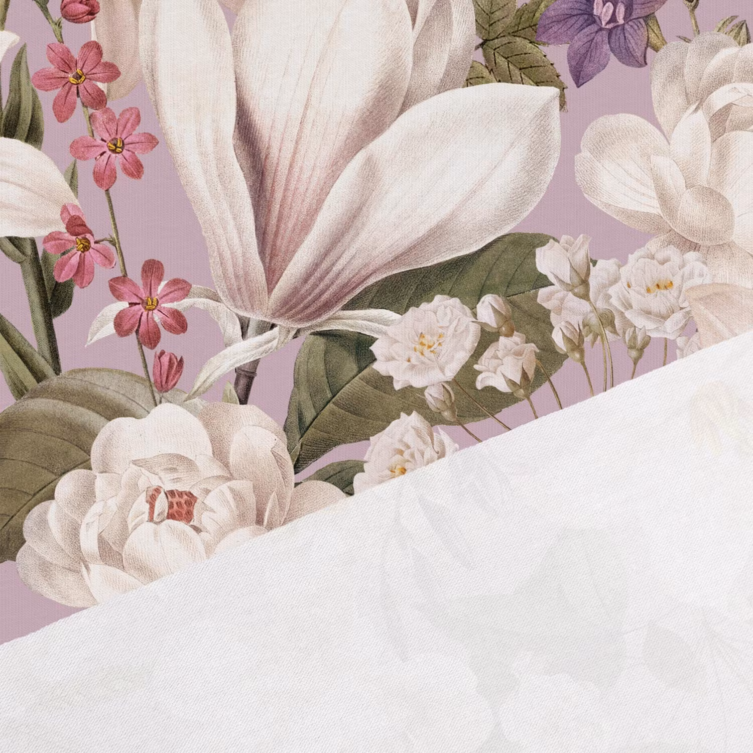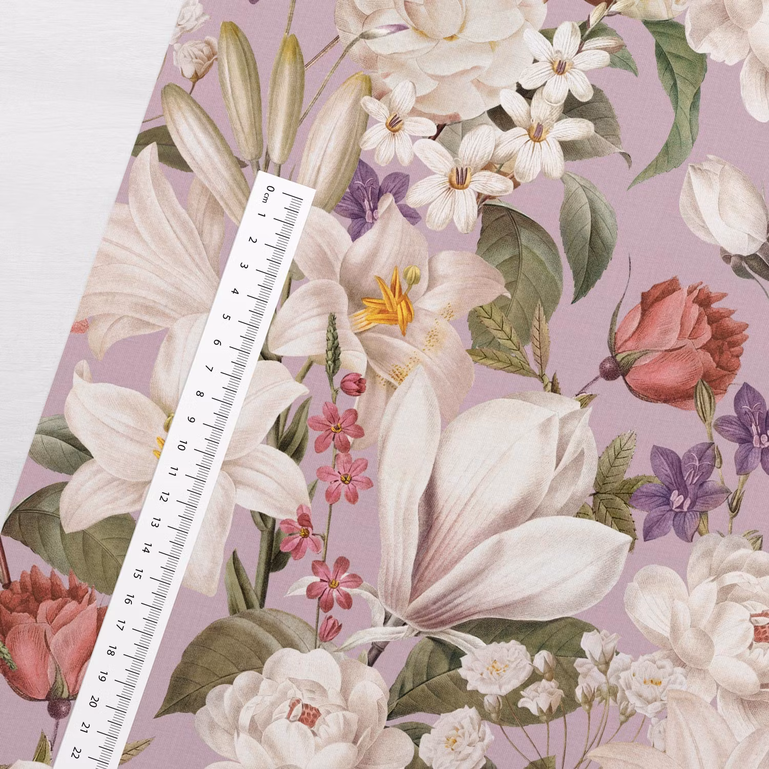 Upptäck vårt mjuka och stretchiga jerseytyg med tryck av vackra blommor med lila bakgrund - perfekt för bekväma klänningar, leggings, toppar, tunikor och pyjamasar.