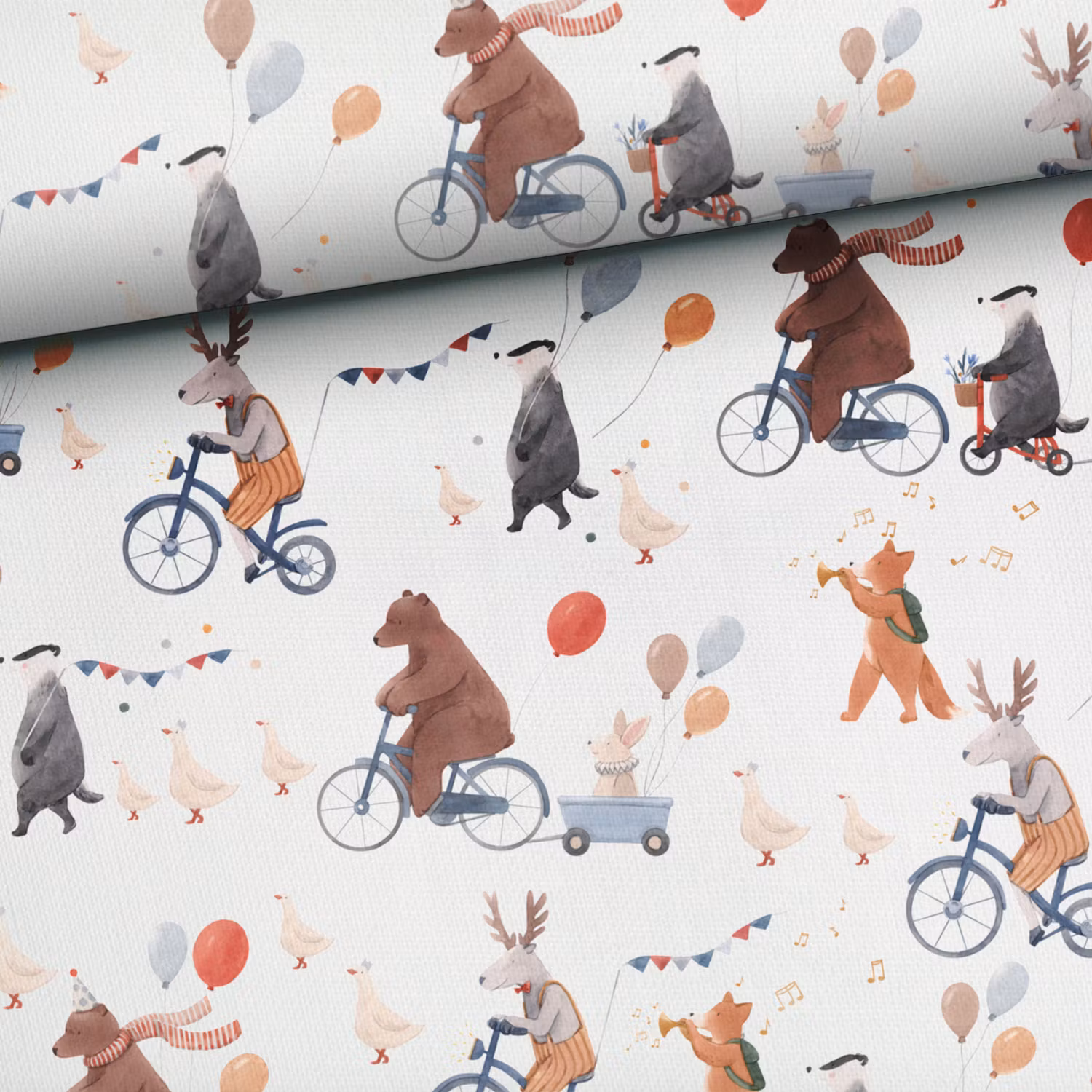 Ett mjukt, stretchigt trikåtyg med tryck av björnar, rävar, älgar och grävlingar på väg till kalas.