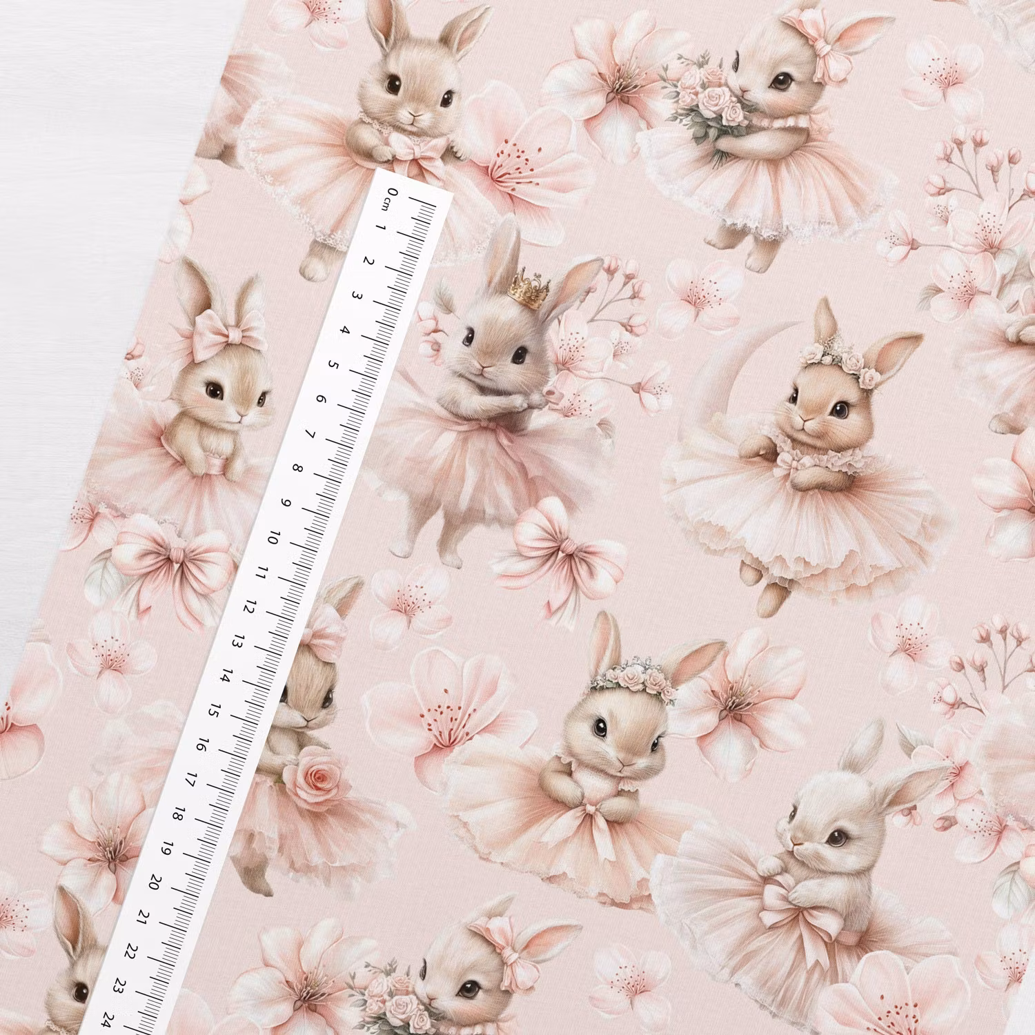 Upptäck vårt mjuka och stretchiga jerseytyg med tryck av kaniner och blommor i ljusrosa - perfekt för bekväma klänningar, leggings, toppar, tunikor och pyjamasar.