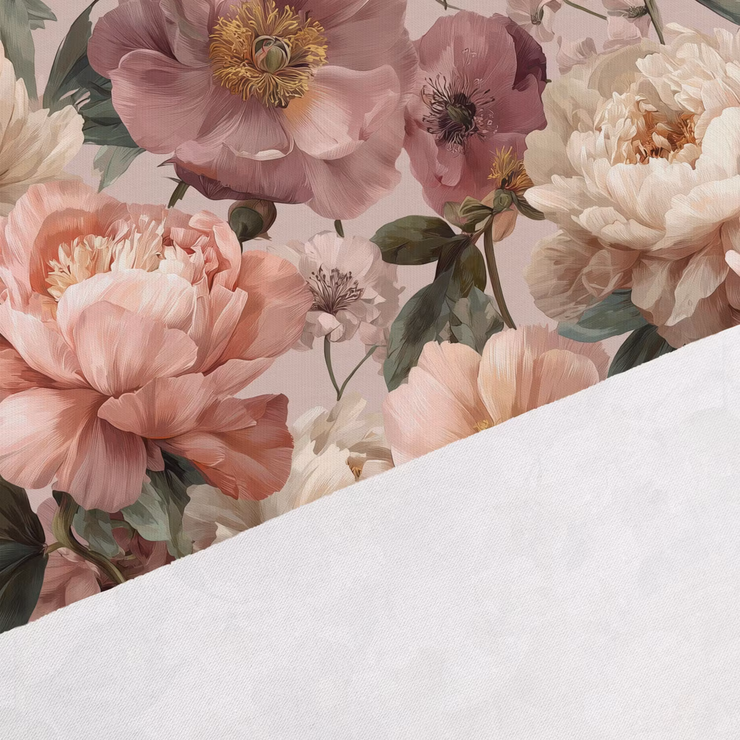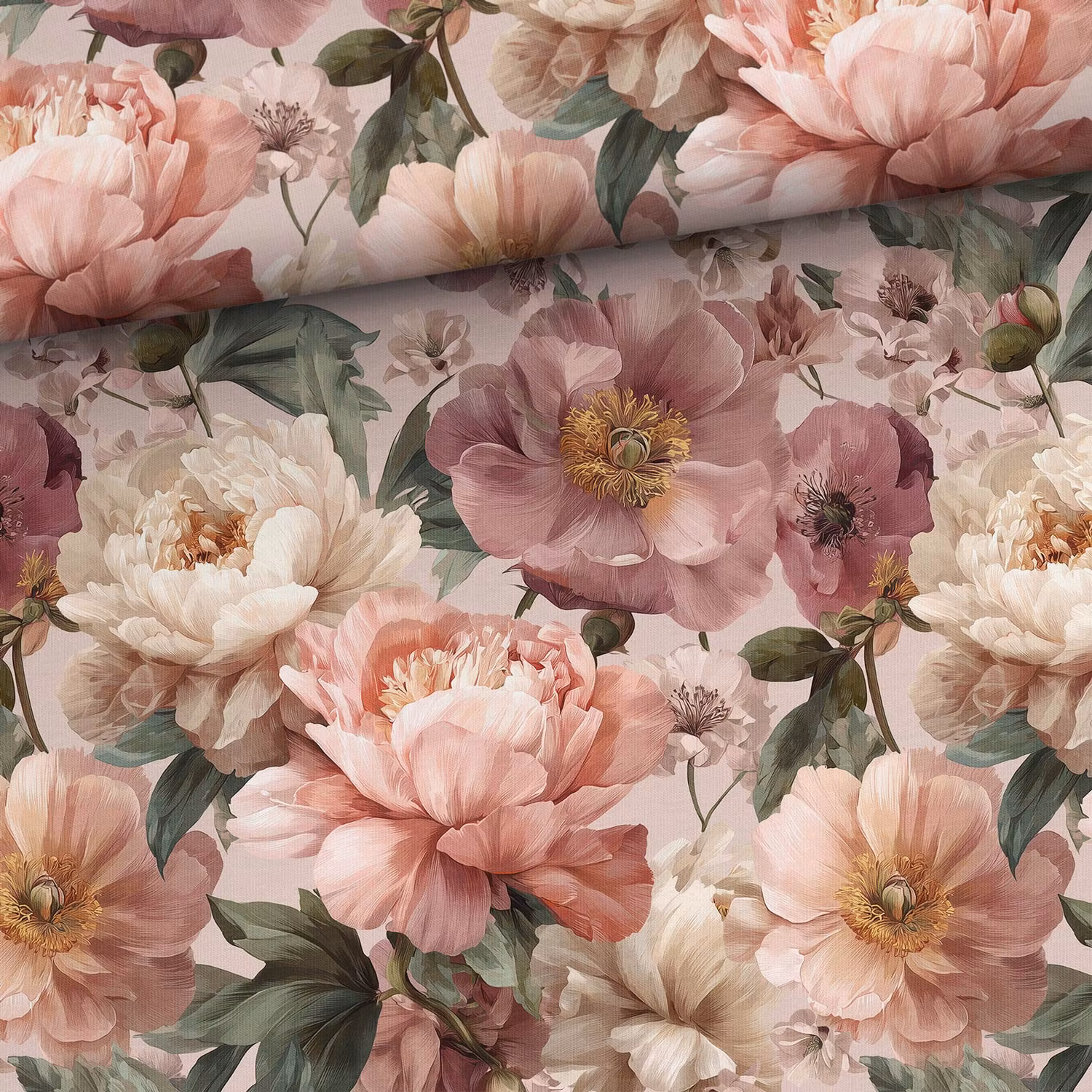 Upptäck vårt mjuka och stretchiga jerseytyg med tryck av vackra blommor i olika toner av aprikost och rosa - perfekt för bekväma klänningar, leggings, toppar, tunikor och pyjamasar.