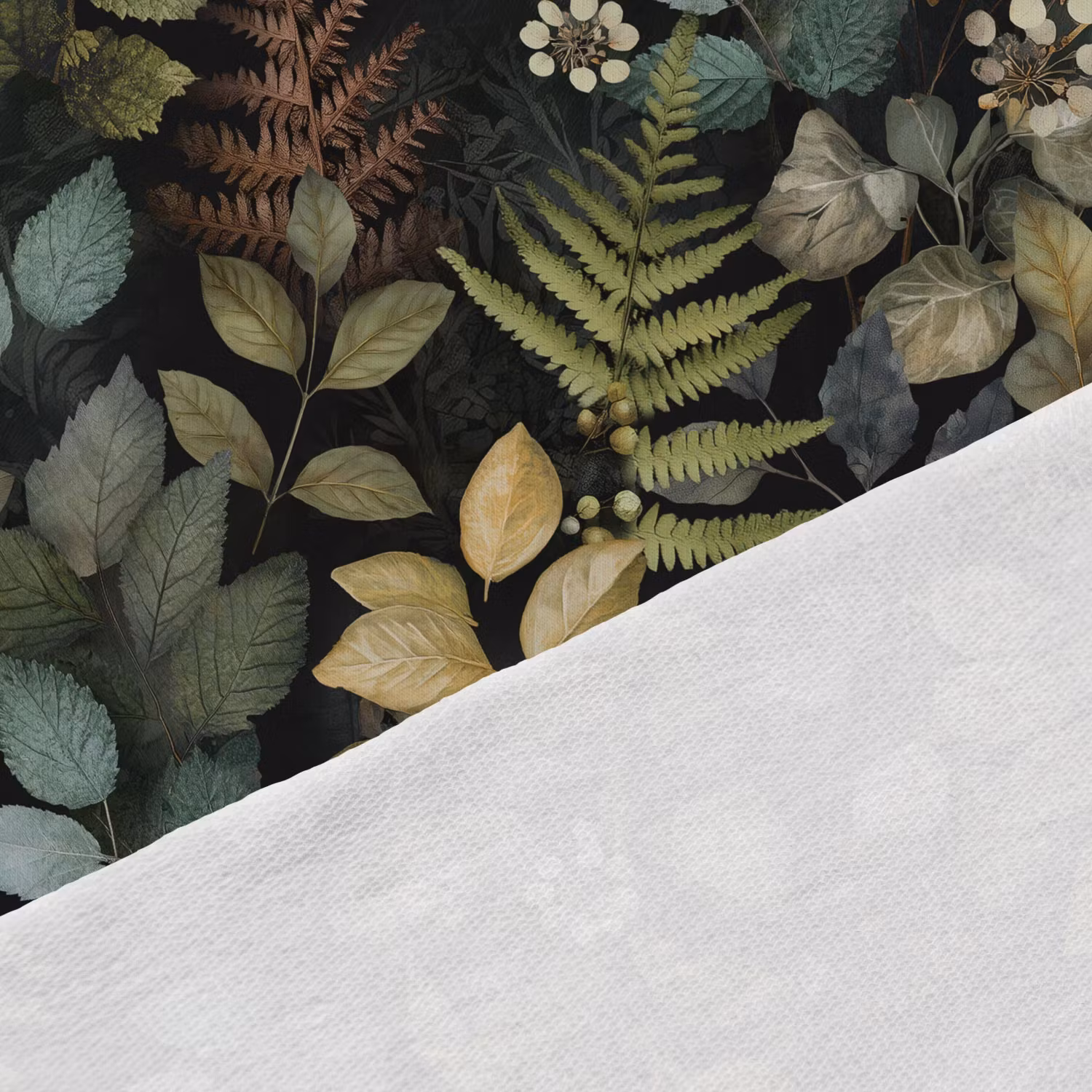 Upptäck vårt mjuka och stretchiga joggingtyg med tryck av skogsblad med mörk bakgrund. Tyget har en öglad insida som ger extra mjukhet och komfort, vilket gör det perfekt för både vardagskläder och mysiga hemmakläder.