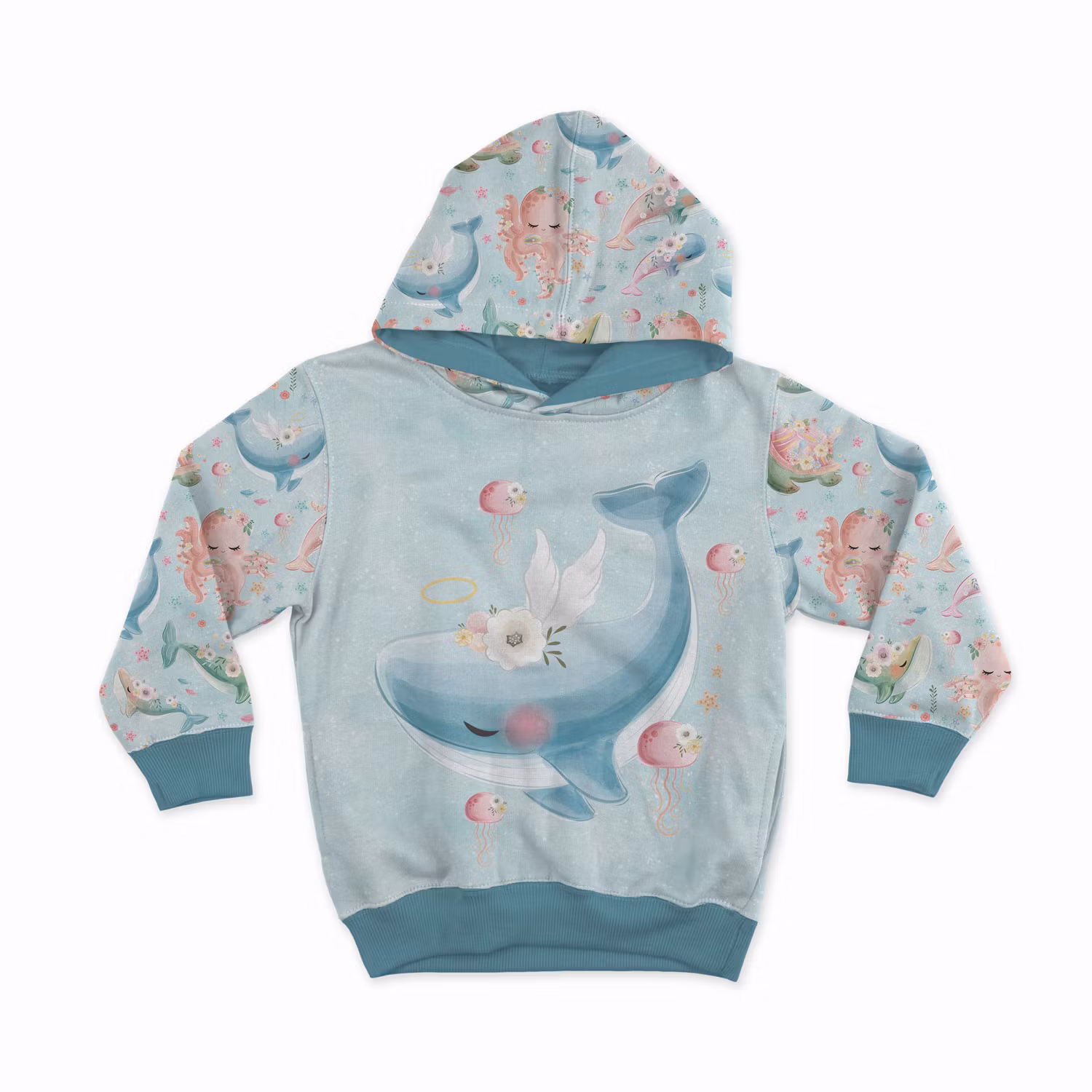 Joggingtyg – Blommig val (40 x 50 cm) är en mjuk och stretchig tygpanel med motiv av en charmig val på blåmönstrad bakgrund. Tyget har en öglad insida som gör det mjukt och skönt mot huden, perfekt för barnplagg och kreativa sömnadsprojekt.