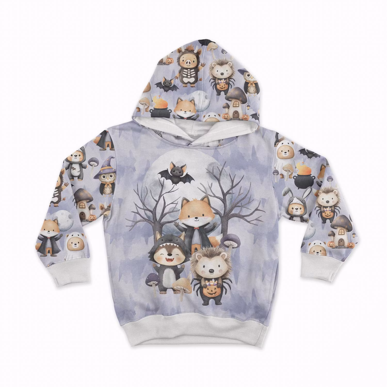 Joggingtygspanel 40 x 50 cm med halloweenmotiv av räv, varg och igelkott. Mjukt, stretchigt tyg med öglad insida – perfekt för barnplagg.