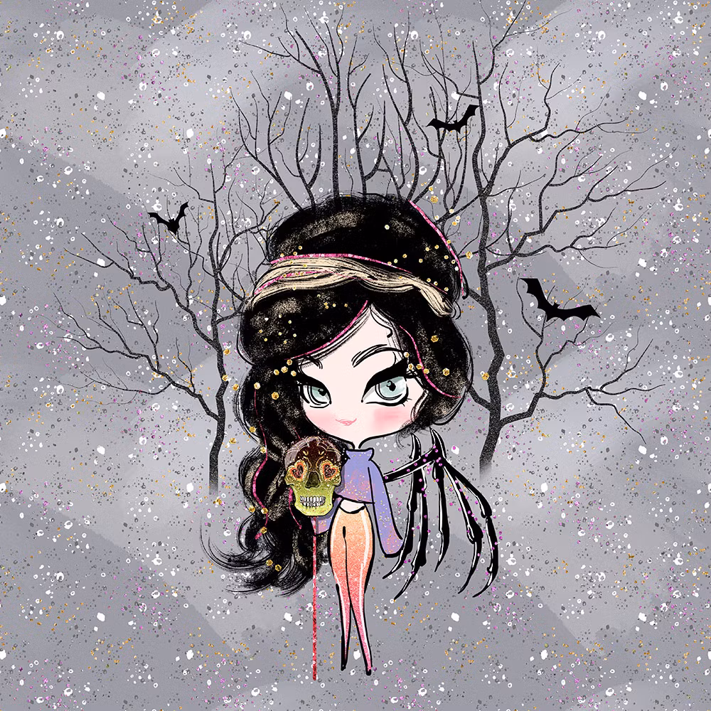 Joggingtyg – Halloweenfe (40 x 50 cm) är en joggingtygspanel med ett lekfullt och fantasifullt motiv av en halloweenfe mot en mjukt gråmönstrad bakgrund. Det barnvänliga uttrycket ger ett magiskt och roligt intryck som passar perfekt till barnplagg och kreativa sömnadsprojekt med höst- och halloweenkänsla.