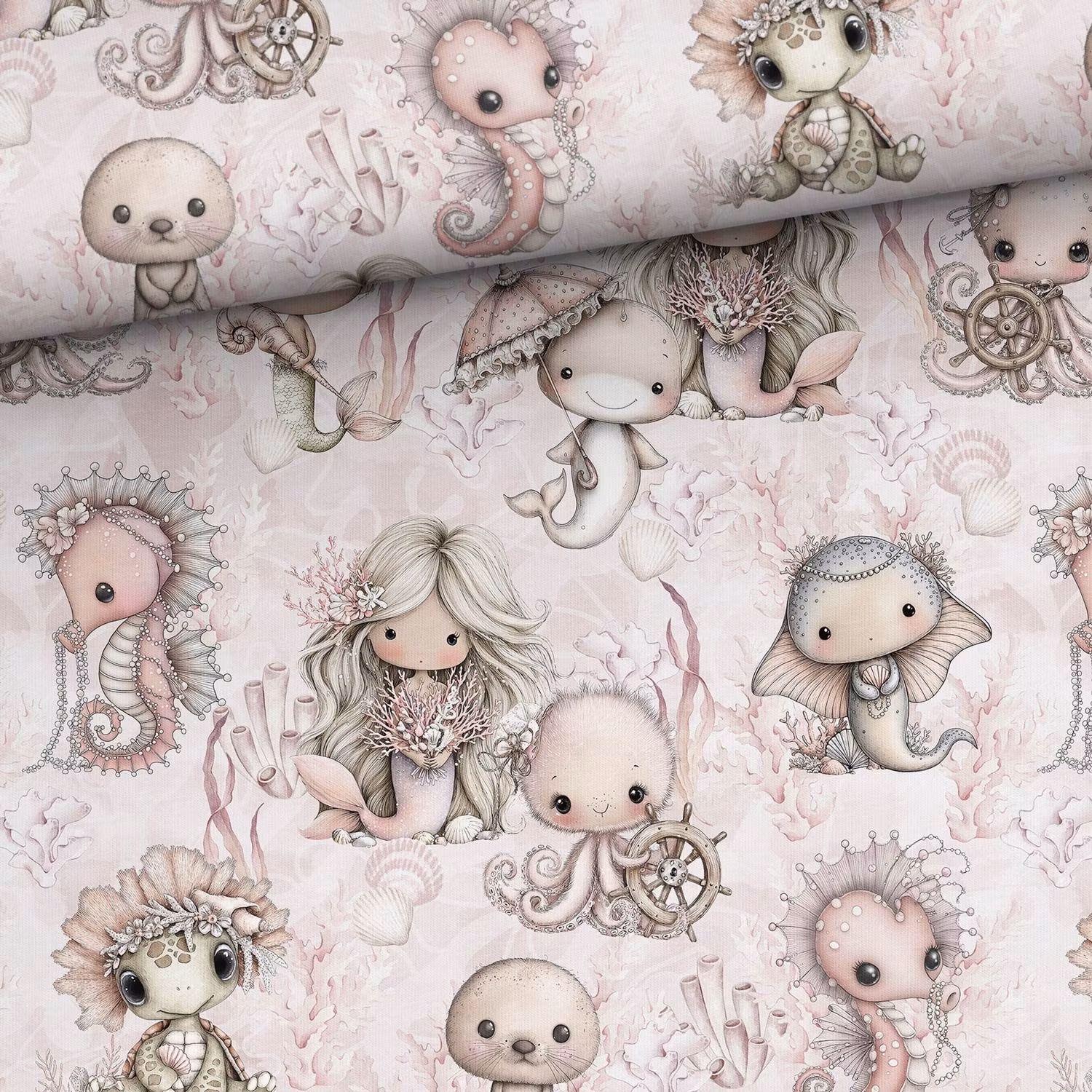 Upptäck vårt mjuka och stretchiga joggingtyg med tryck av sjöjungfrur, sköldpaddor och havsdjur i rosa nyanser. Tyget har en öglad insida som ger extra mjukhet och komfort, vilket gör det perfekt för både vardagskläder och mysiga hemmakläder.