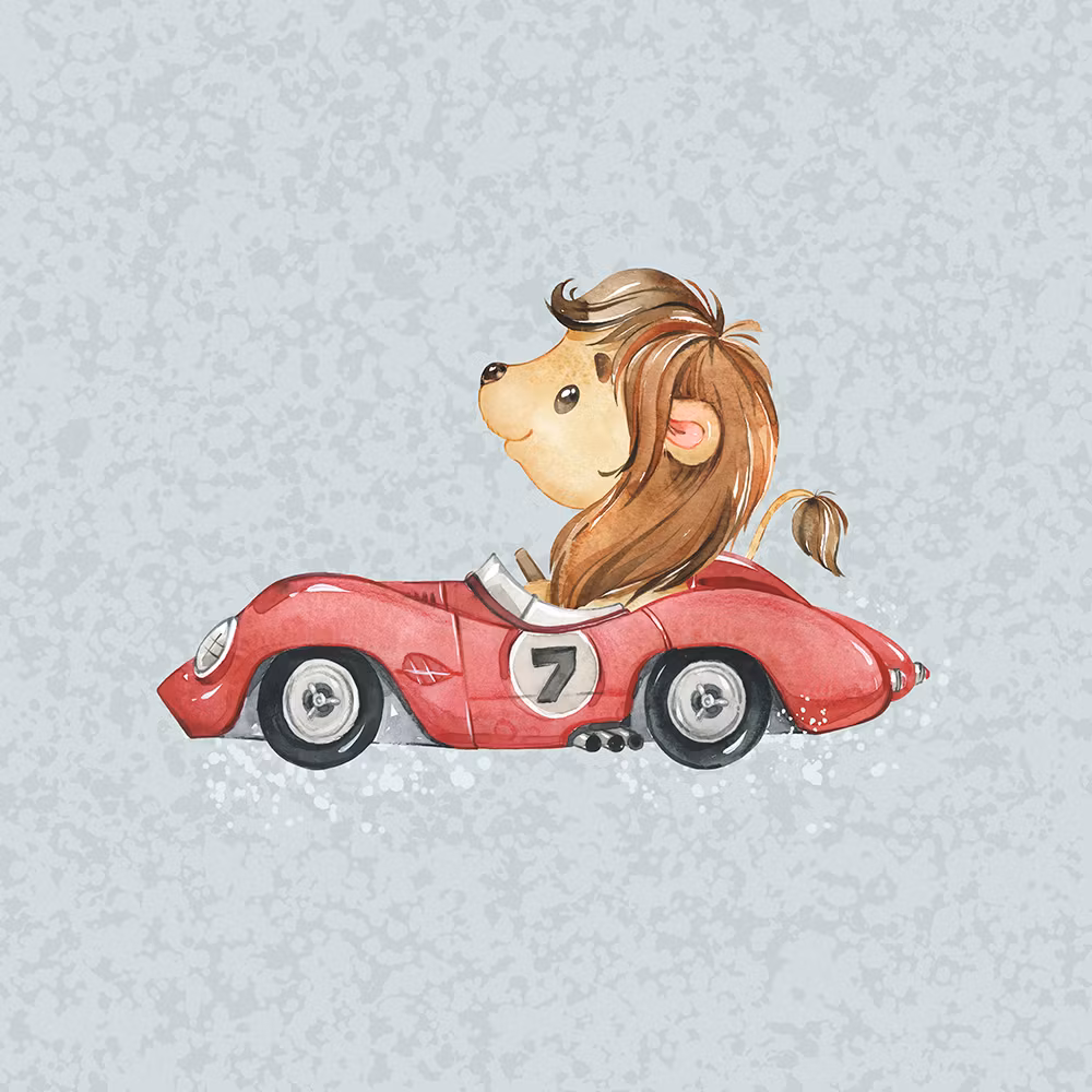 En 40 x 50 cm bit av mjukt, stretchigt joggingtyg med tryck av ett lejon i bil på gråmönstrad bakgrund.