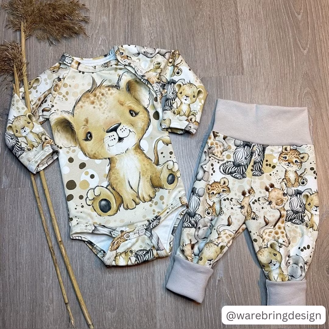 Skapa charmiga och lekfulla barnplagg med Joggingtyg Lejonunge. Denna 40 x 50 cm panel i mjukt, stretchigt joggingtyg har en söt lejonunge på prickig bakgrund (ungefär 25 x 22 cm) och en mjuk öglad insida som gör tyget både bekvämt och hållbart.