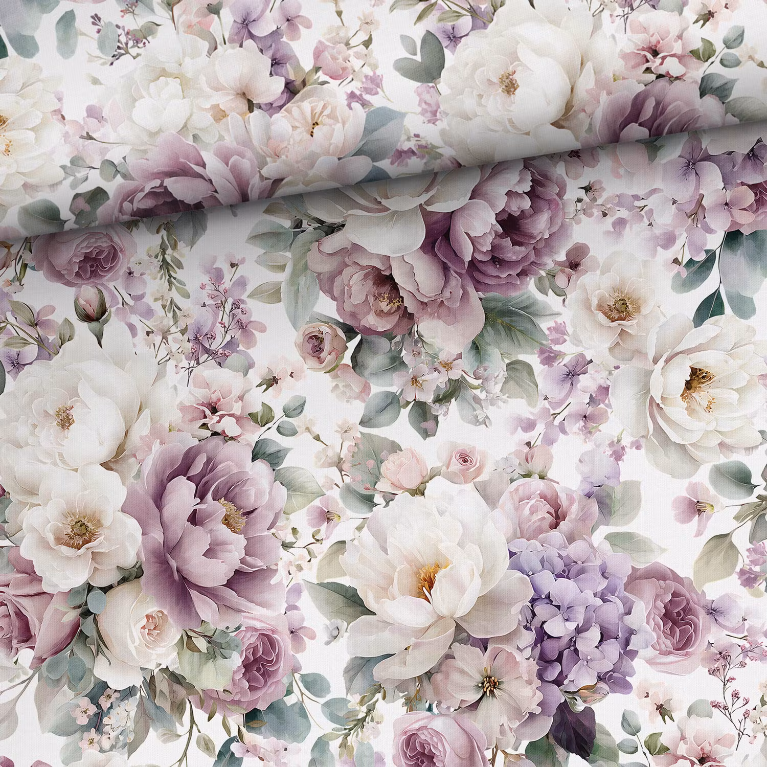 Mjukt, stretchigt joggingtyg med tryck av vackra blommor. Perfekt för tröjor, tunikor, joggingbyxor, leggings och mössor. Säljs per decimeter.