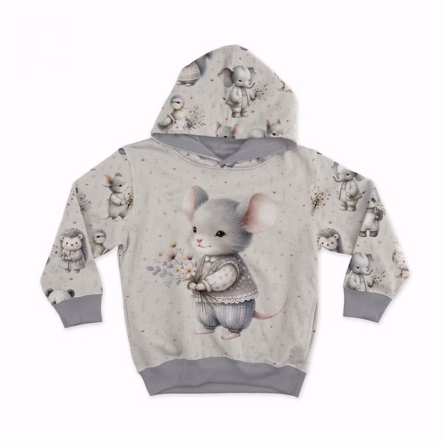 Joggingtyg – Mus med bukett (40 x 50 cm) är en joggingtygspanel med ett mjukt och charmigt motiv av en söt mus med bukett på grå bakgrund. Det harmoniska motivet ger ett lugnt och lekfullt uttryck som passar utmärkt till barnplagg och kreativa sömnadsprojekt.