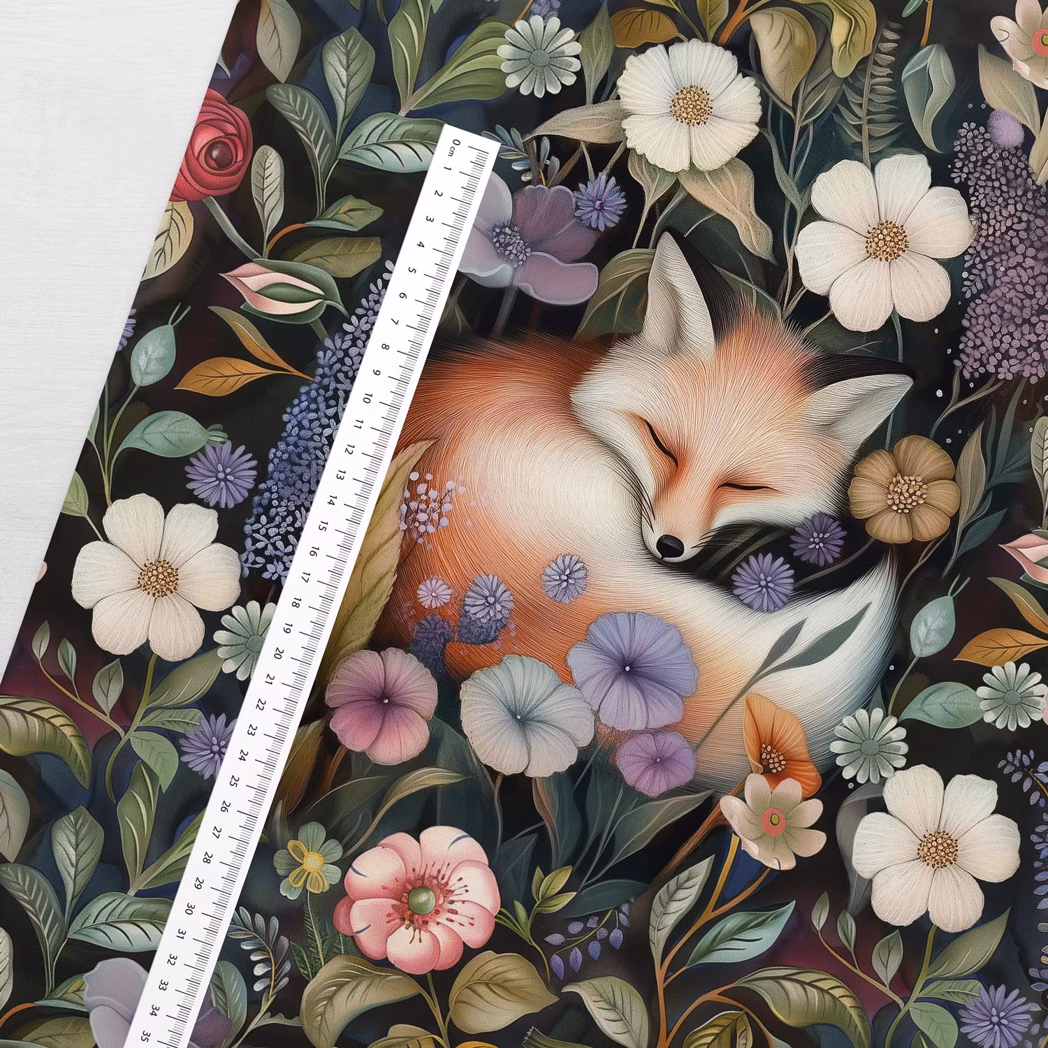 Joggingtyg – Rävdröm (40 x 50 cm) är ett mjukt och följsamt joggingtyg med tryck av en sömnig räv bland blommor. Tyget är lätt stretchigt och har en öglad insida, vilket gör det bekvämt mot huden och enkelt att arbeta med.