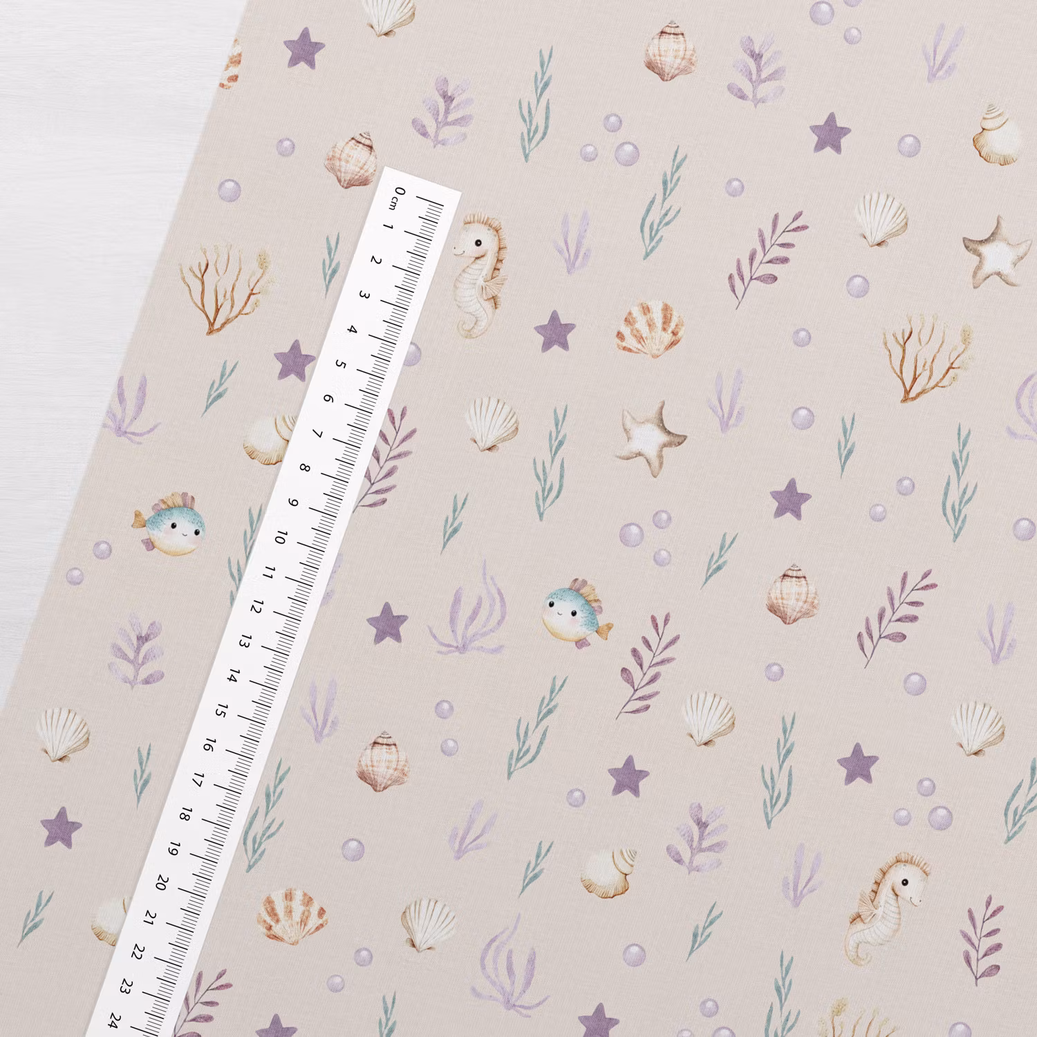 Ett mjukt, stretchigt joggingtyg med tryck av fiskar, sjöhästar och snäckor med beige bakgrund.