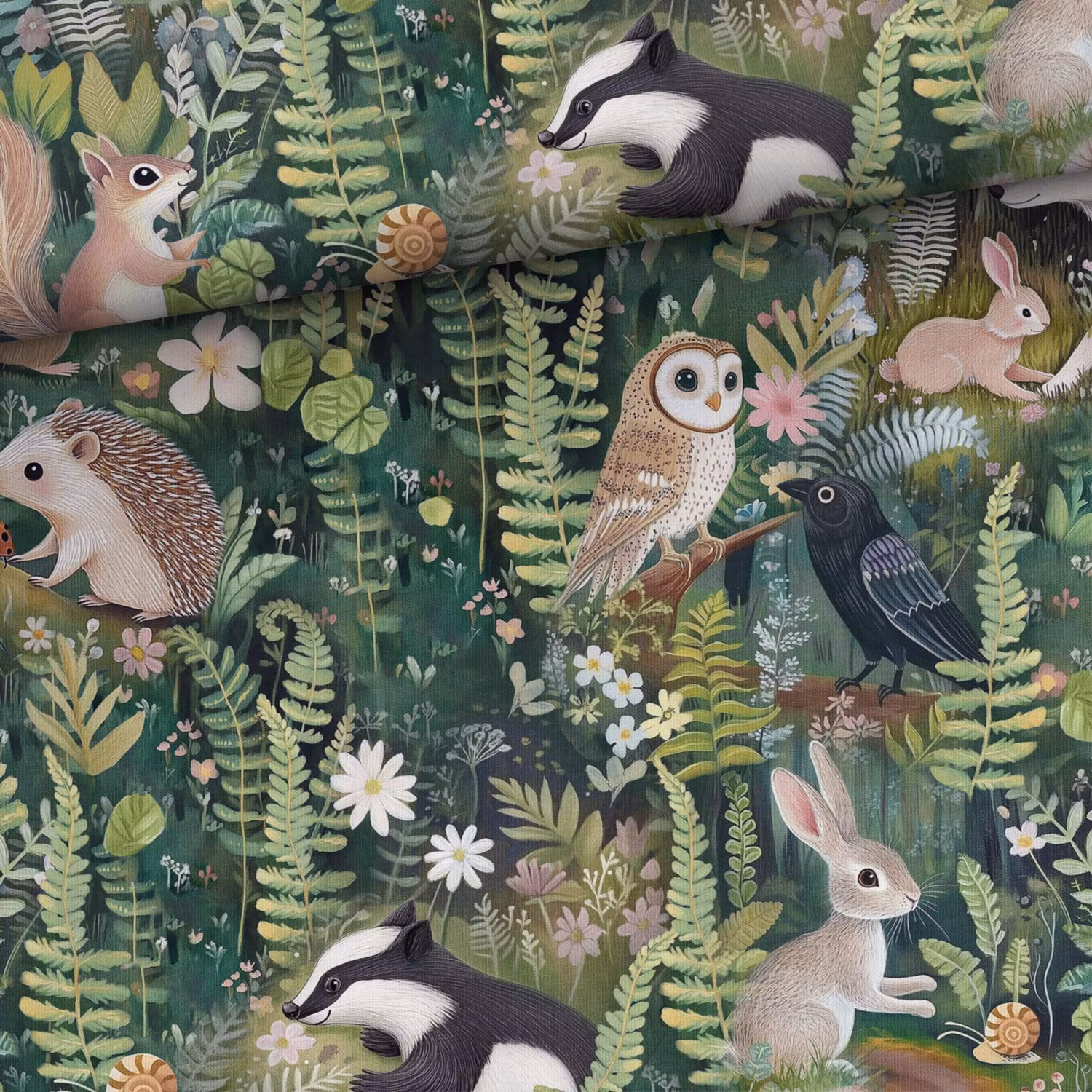 Ett mjukt, stretchigt joggingtyg med tryck av ekorrar, igelkottar, grävlingar och kaniner.