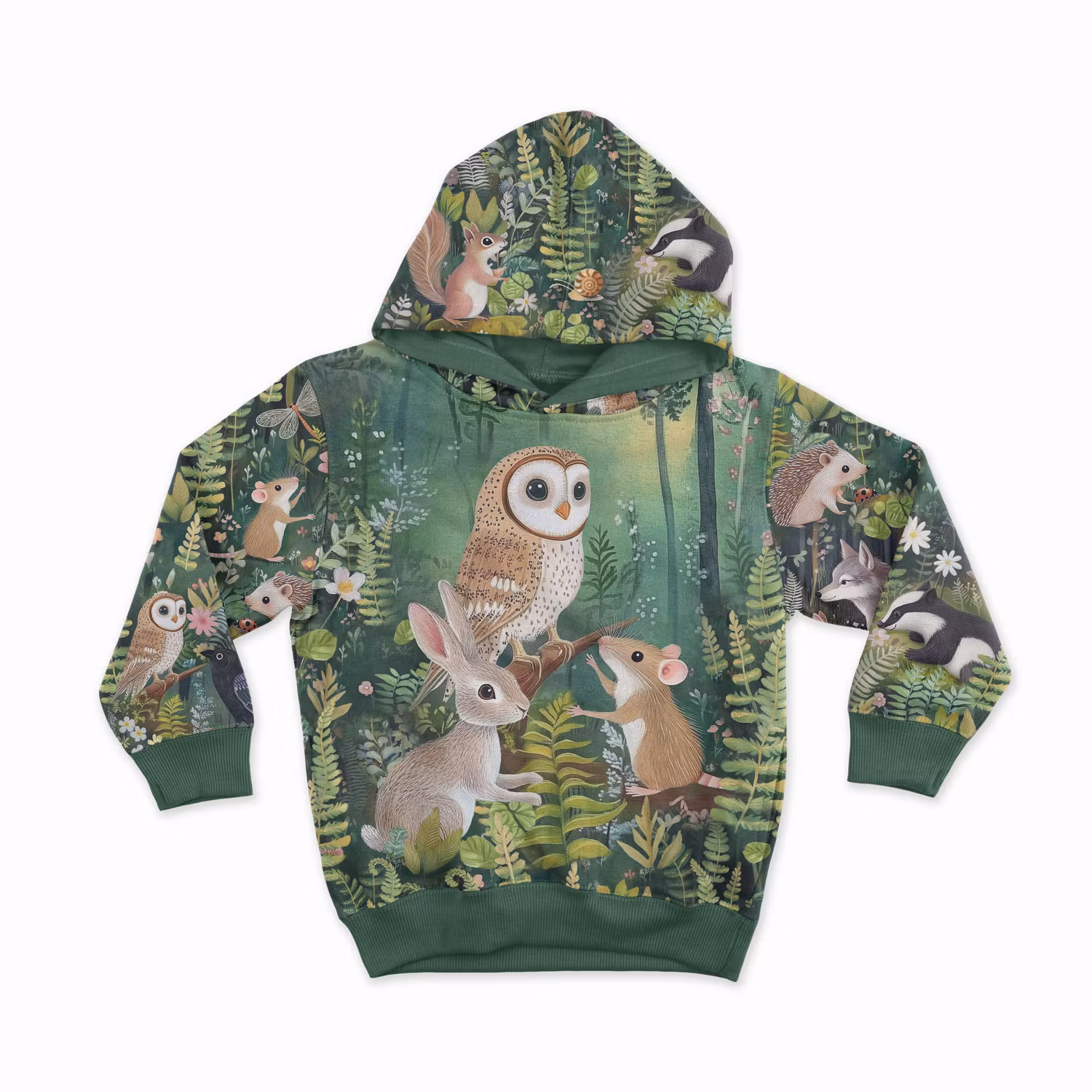 Ett mjukt, stretchigt joggingtyg med tryck av skogsdjur och blad. Passar fint för sömnad av bekväma tröjor, byxor, leggings och mössor.