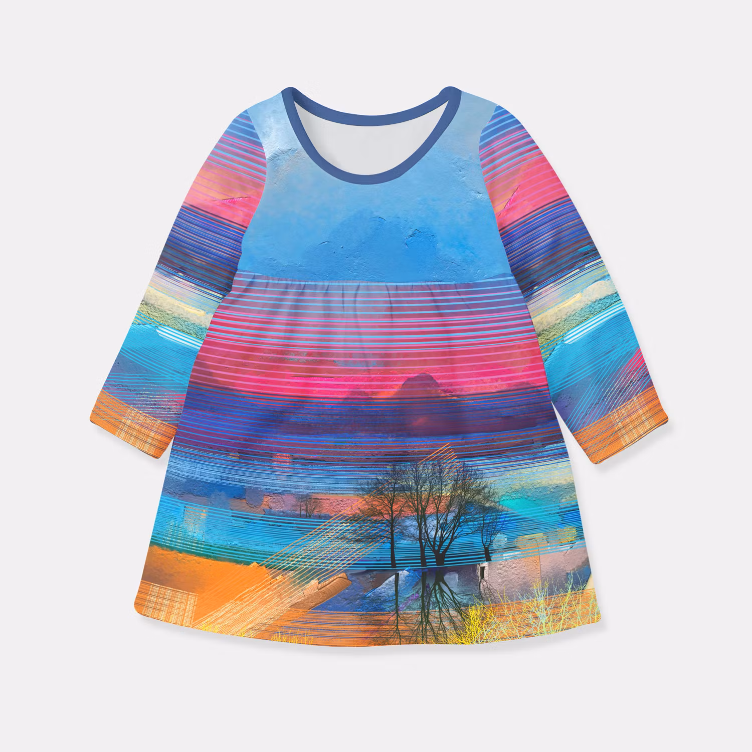 Joggingtygspanel i storlek 110 x 72 cm med tryck av en solnedgång. Stretchigt tyg med öglad insida – perfekt för tröjor, klänningar och barnkläder.