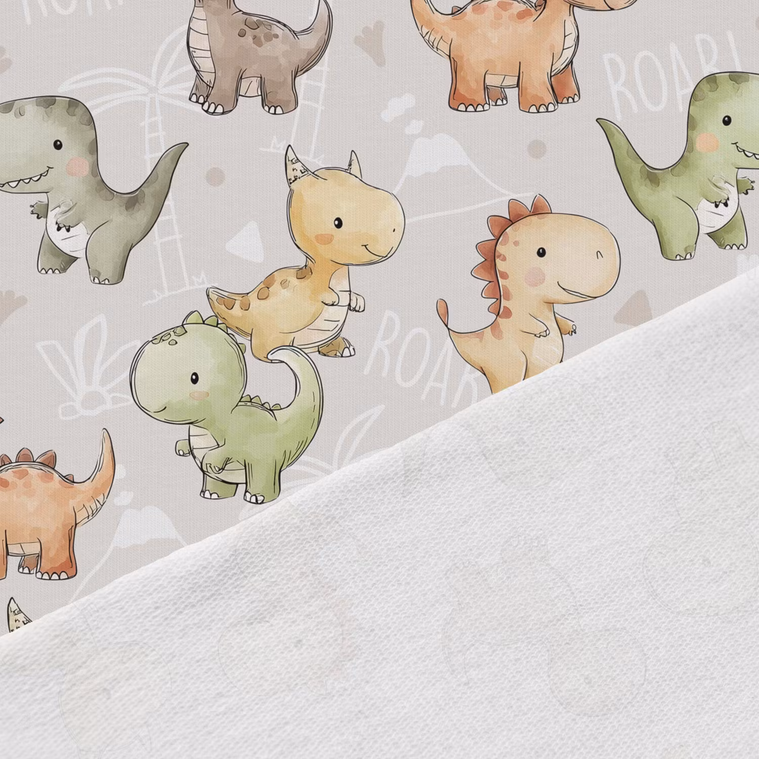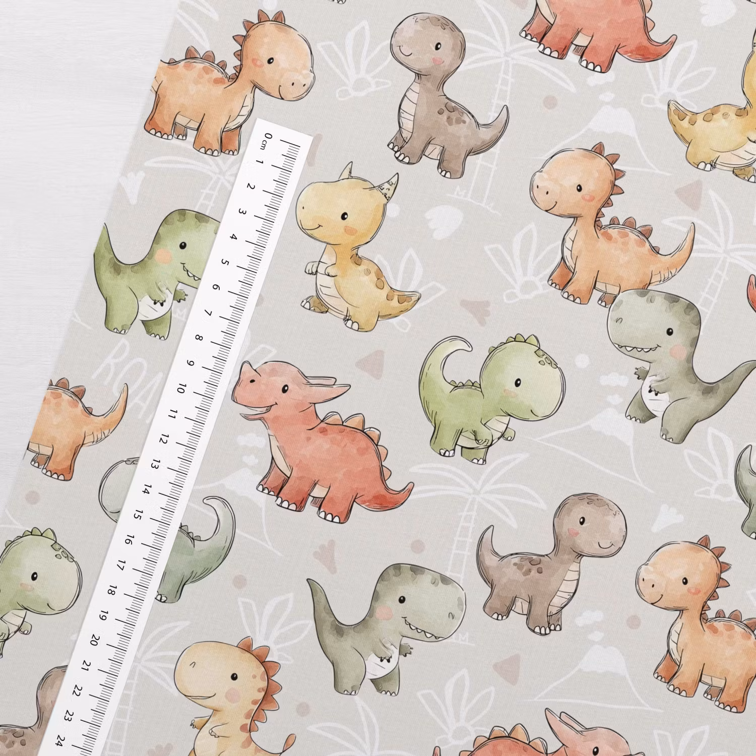 Upptäck vårt mjuka och stretchiga joggingtyg med tryck av söta dinosaurer på ljusgrå bakgrund. Tyget har en öglad insida som ger extra mjukhet och komfort, vilket gör det perfekt för både vardagskläder och mysiga hemmakläder.
