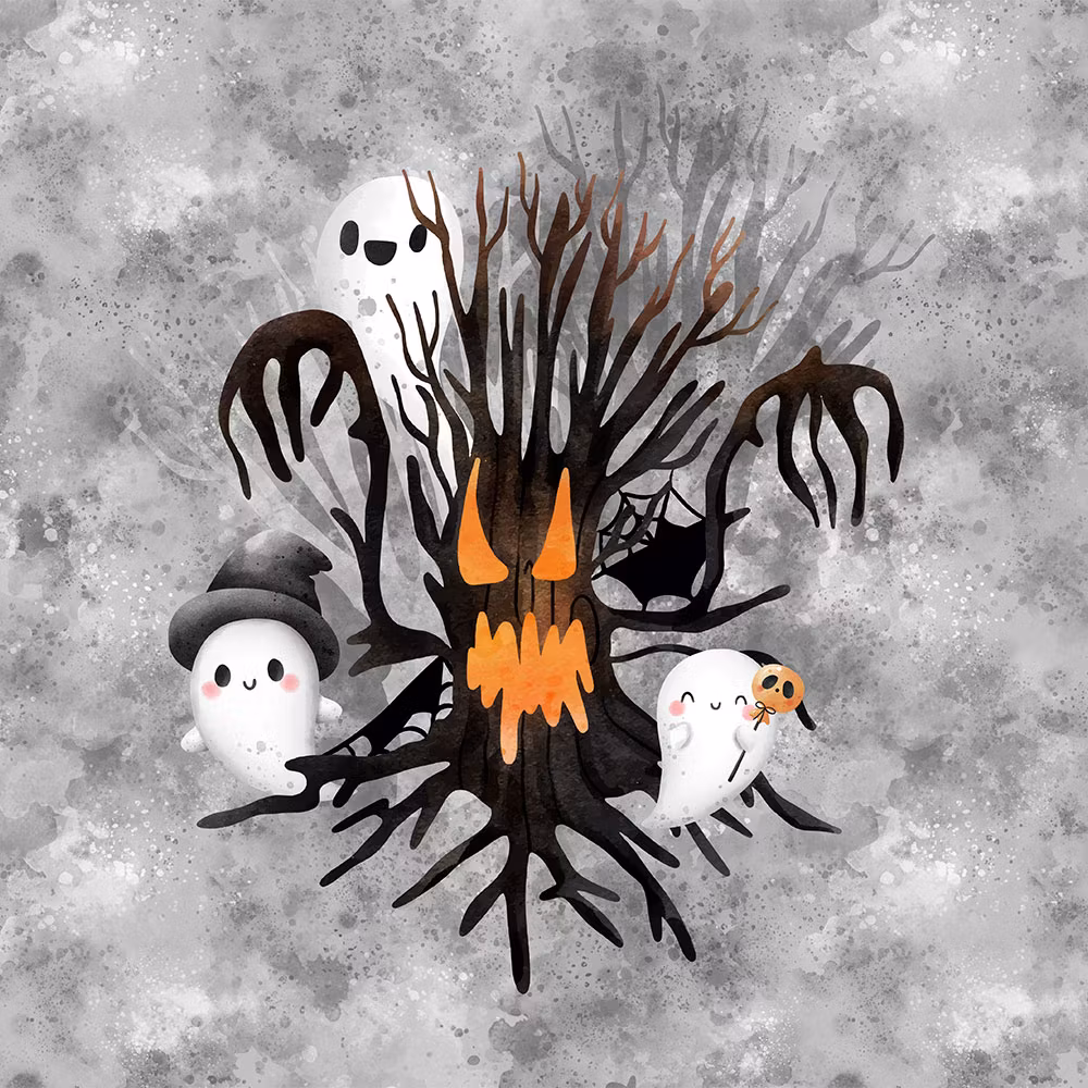 Joggingtygspanel i storlek 40 x 50 cm med tryck av ett träd och söta spöken.Mjukt, stretchigt tyg med öglad insida – perfekt för barnplagg.