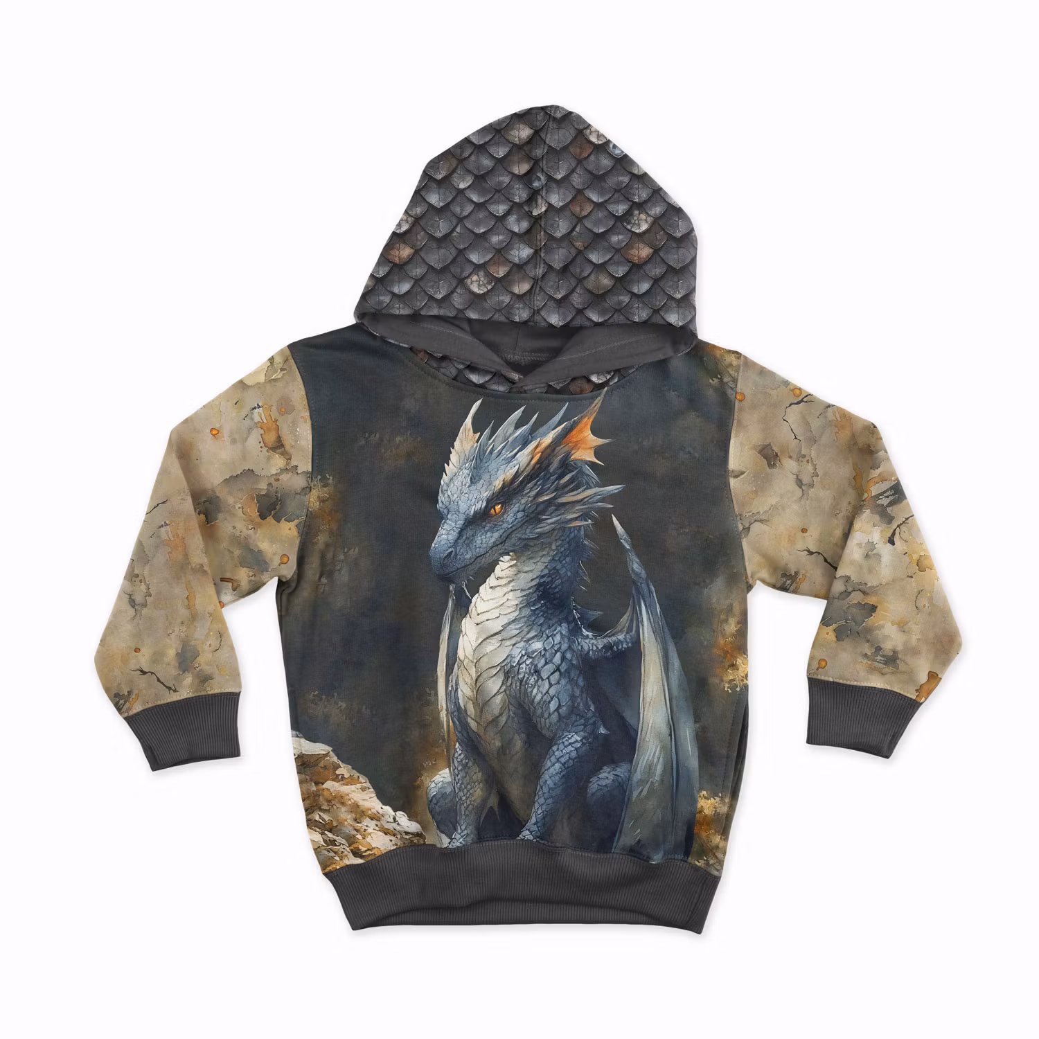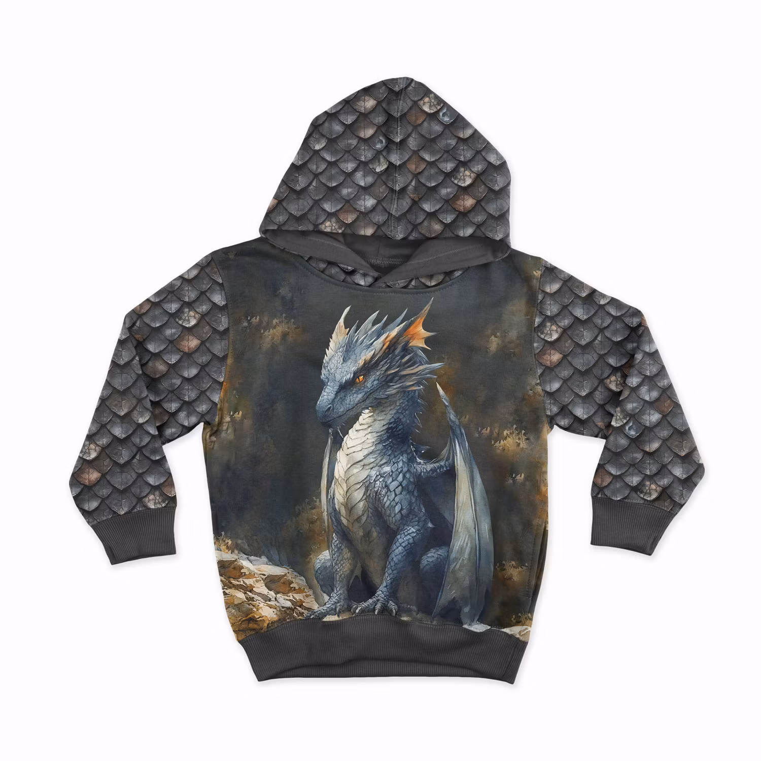 Joggingtyg – Stordraken (40 x 50 cm) är en effektfull panel i mörka, djupa nyanser med ett detaljrikt motiv av en grå drake – perfekt för dig som vill skapa unika och iögonfallande plagg. Det dramatiska motivet passar särskilt bra till barnkläder och coola vardagsplagg med karaktär.