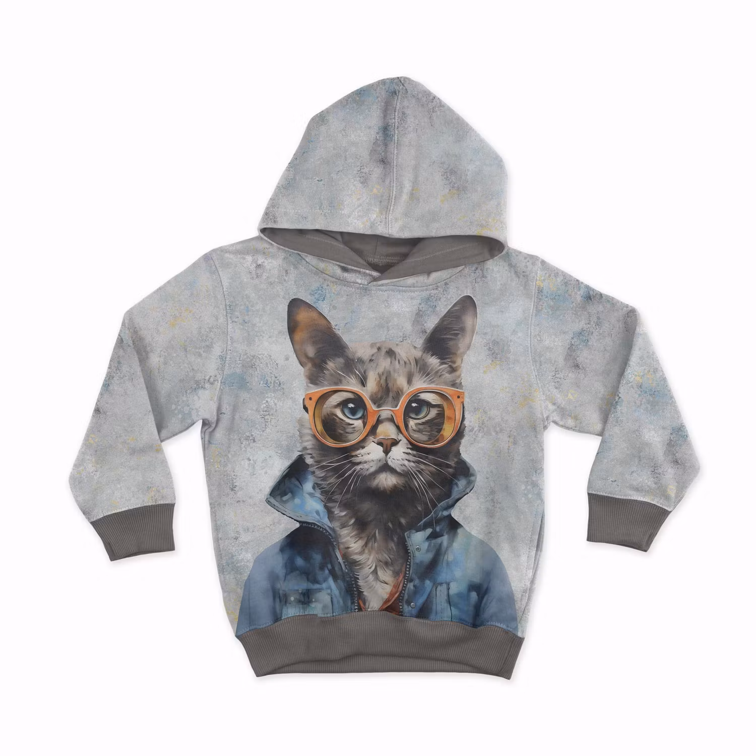 Joggingtygspanel i storlek 40 x 50 cm med tryck av en tuff katt i jacka och glasögon. Mjukt, stretchigt tyg med öglad insida – perfekt för barnplagg.