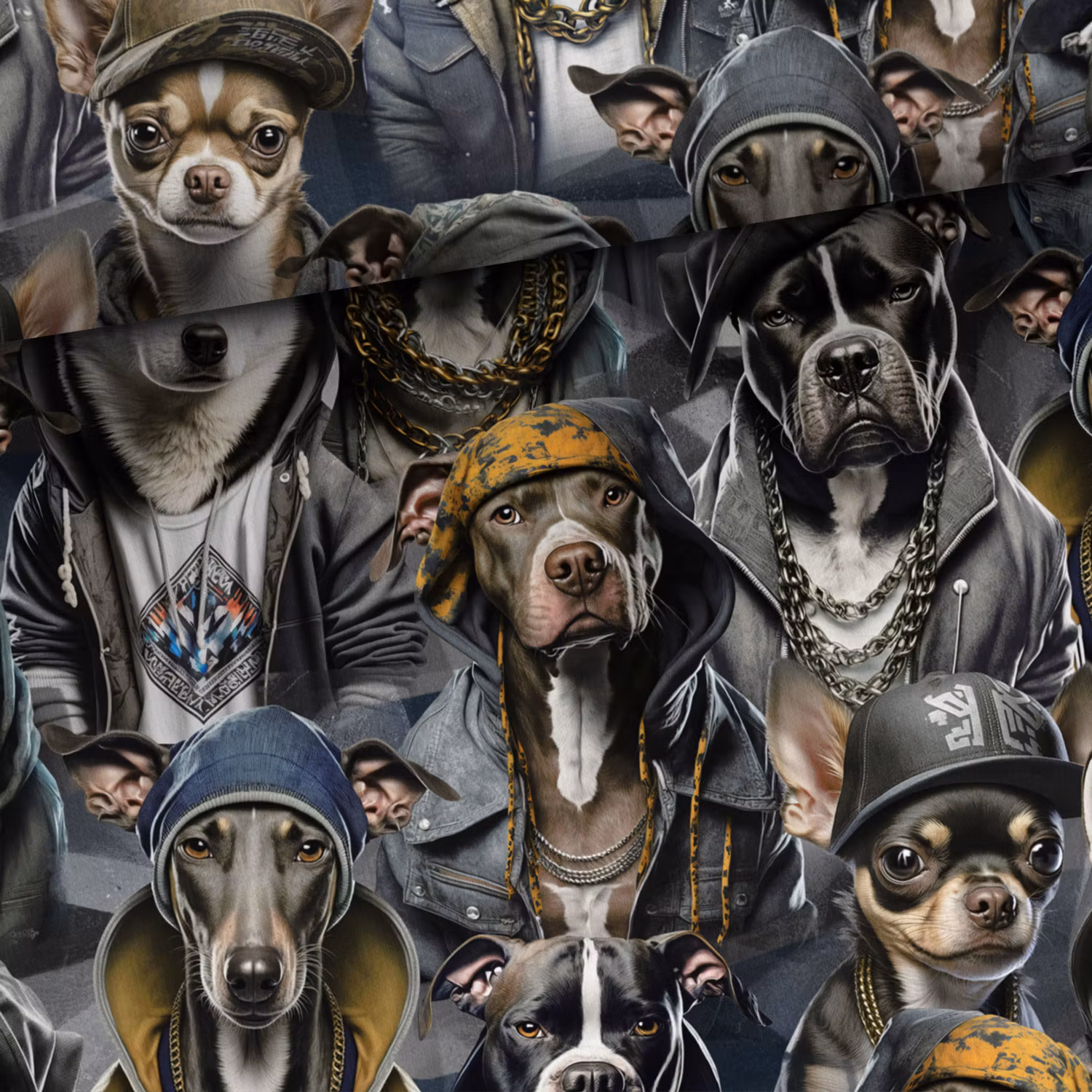 Ett mjukt, stretchigt joggingtyg med tryck av coola hundar i kläder. Passar fint för sömnad av bekväma hoodies, sweatshirts, byxor och mössor.