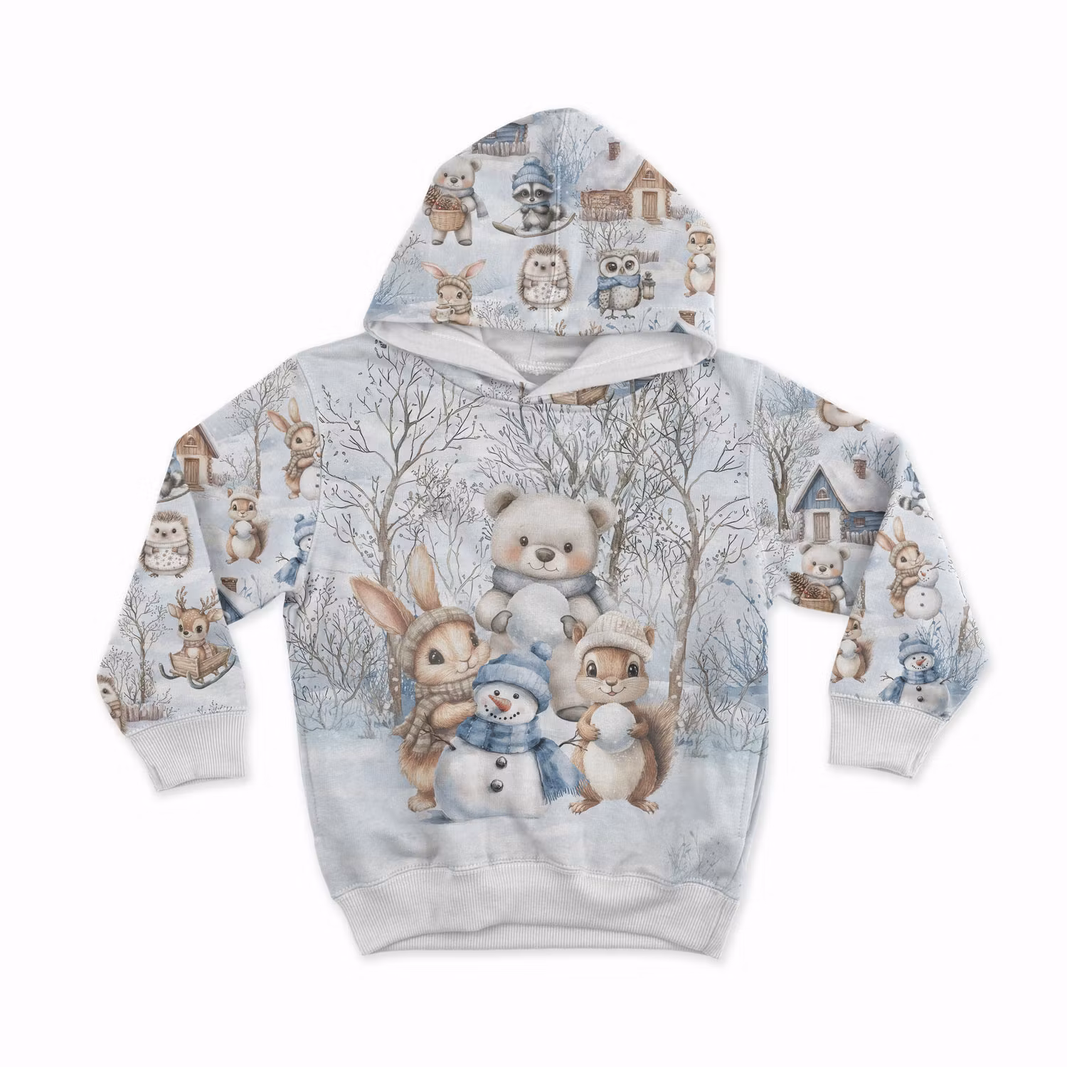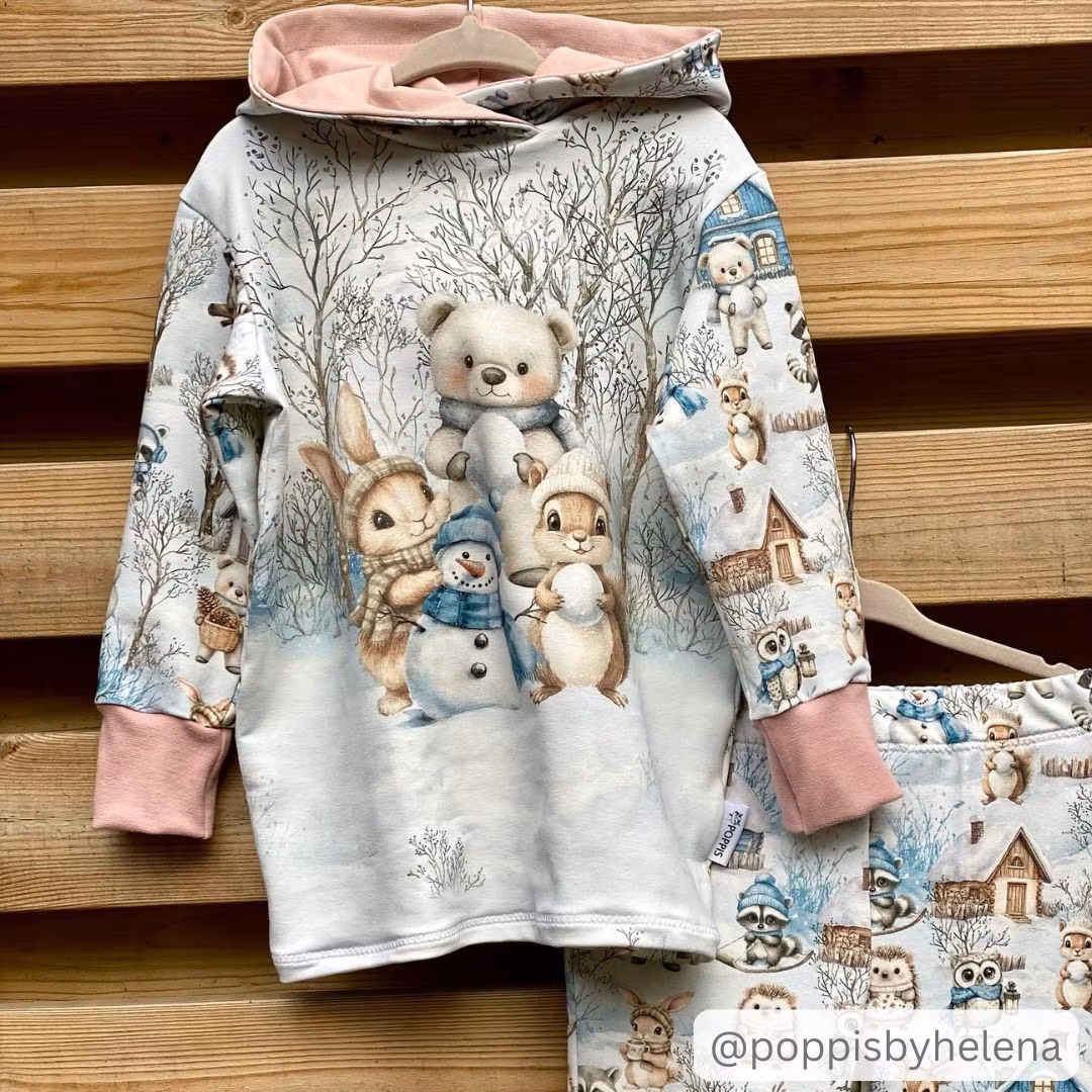 Ett mjukt, stretchigt joggingtyg med tryck av söta djur i en vinterskog. Passar fint för sömnad av sköna tröjor, byxor, klänningar och mössor.