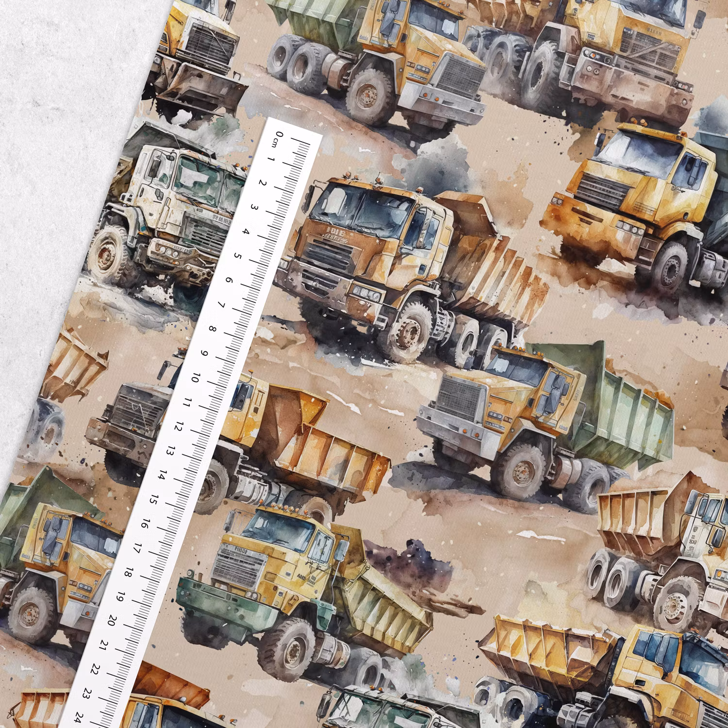 STUV 38 cm - Ett mjukt, stretchigt trikåtyg med tryck av lastbilar. Passar fint för att sy sköna t-shirts, shorts, bodys, byxor och mössor i.