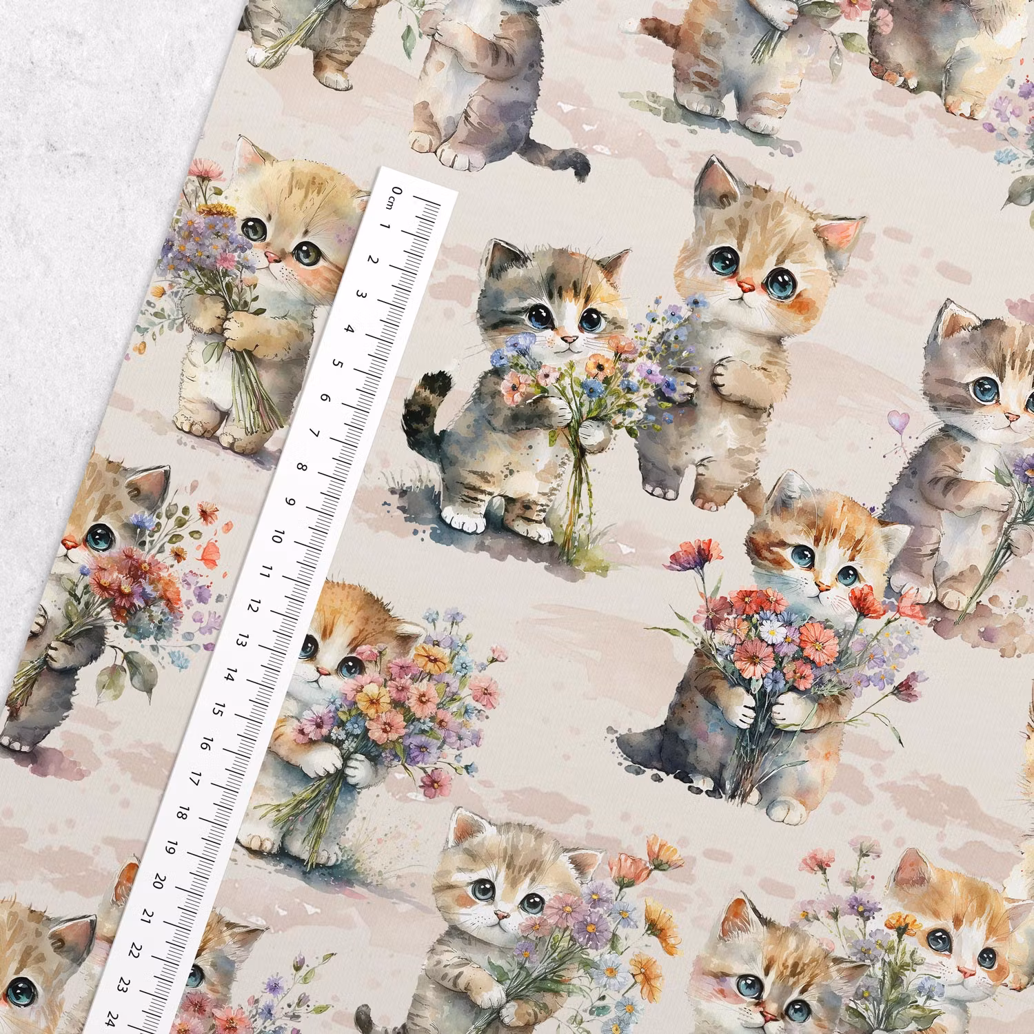 Ett mjukt, vävt bomullstyg med tryck av söta katter med blombuketter.