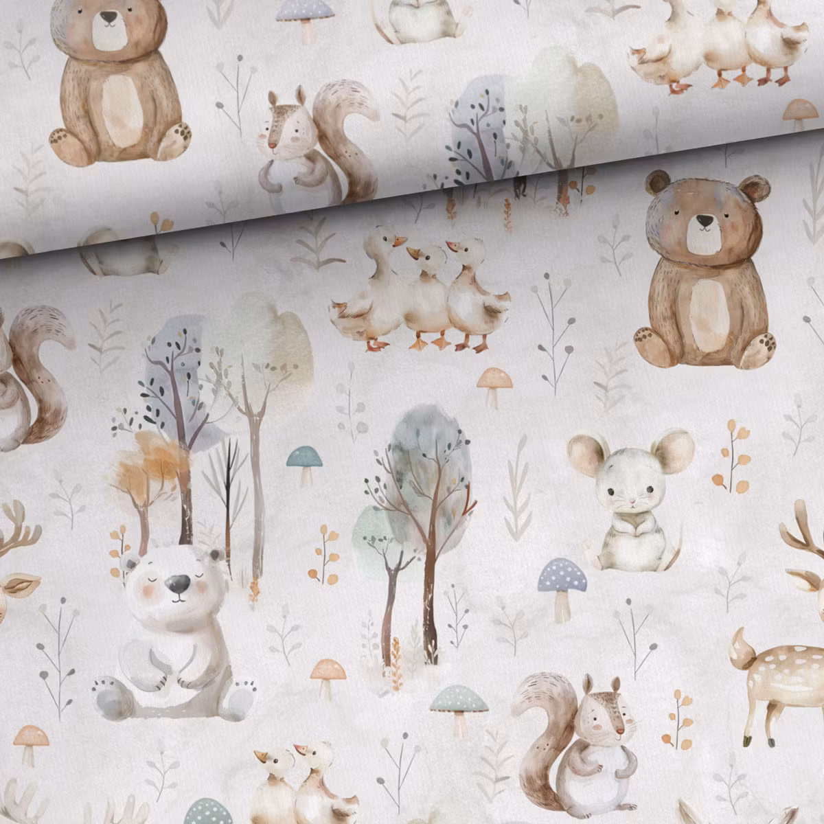 Ett mjukt, vävt bomullstyg med tryck av söta djur i ljusa nyanser.