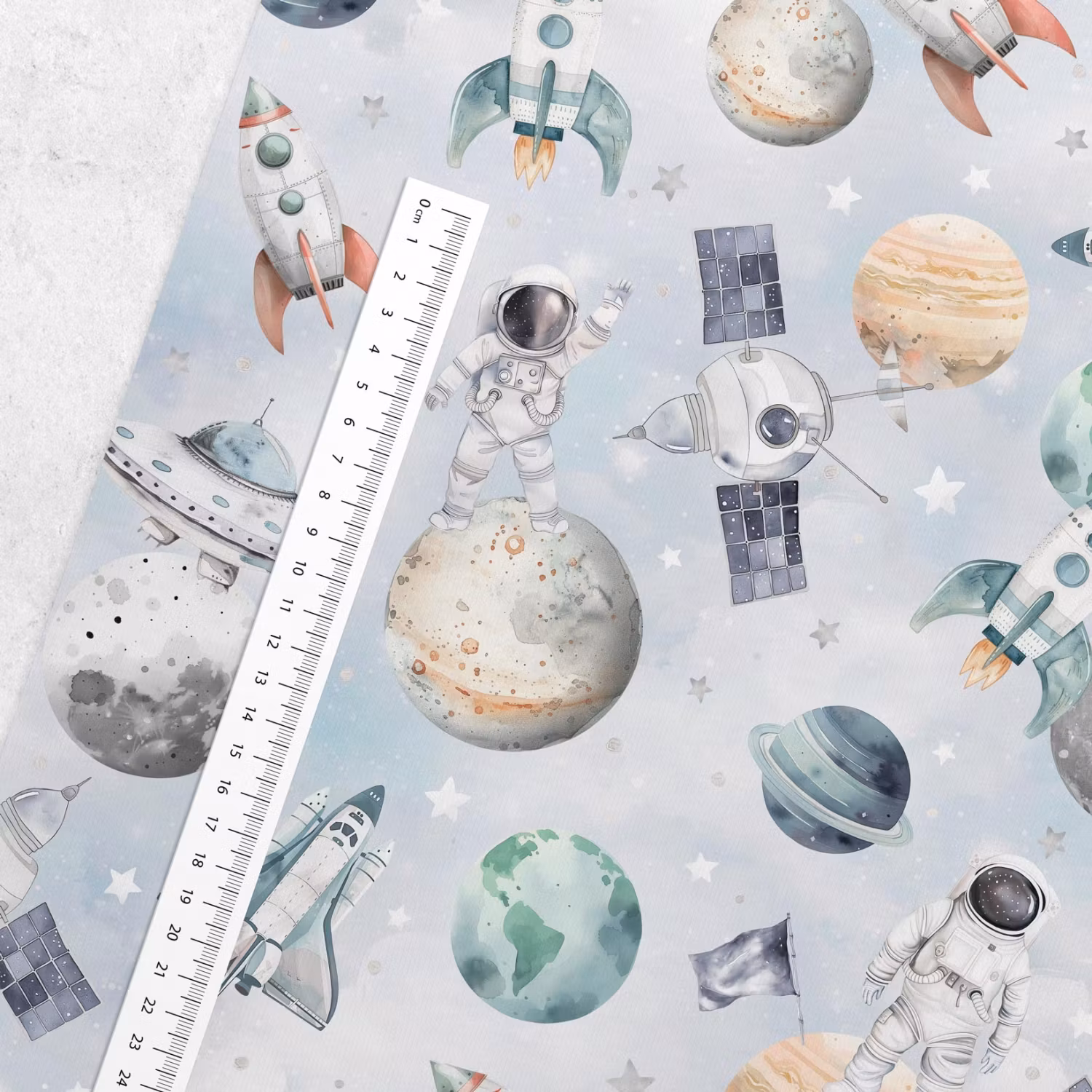 Ett mjukt, stretchigt trikåtyg med tryck av rymdfarkoster, planeter och astronauter.
