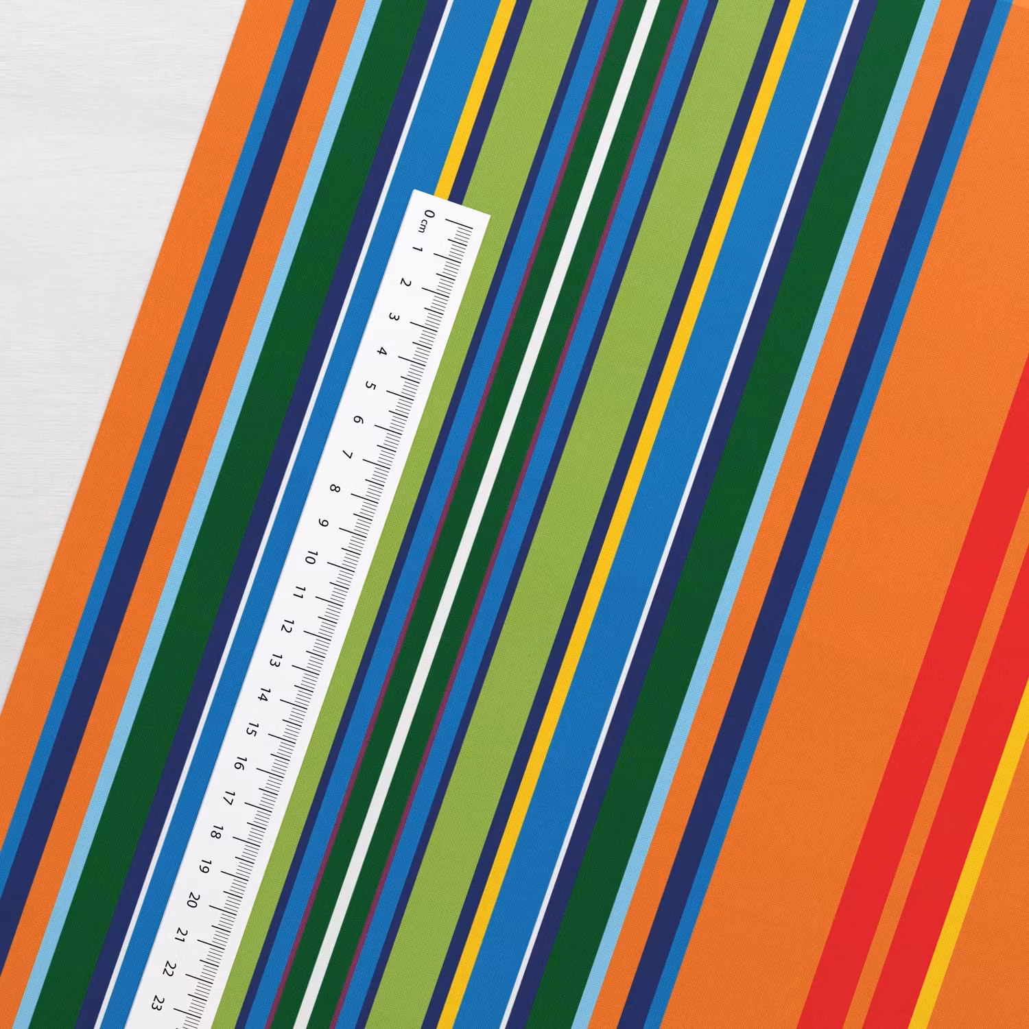 STUV 15 cm - Ett mjukt, vävt bomullstyg med tryck av ränder i orange, grönt, rött, gult och blått. Fint att sy påslakan, vimplar, gardiner, klänningar