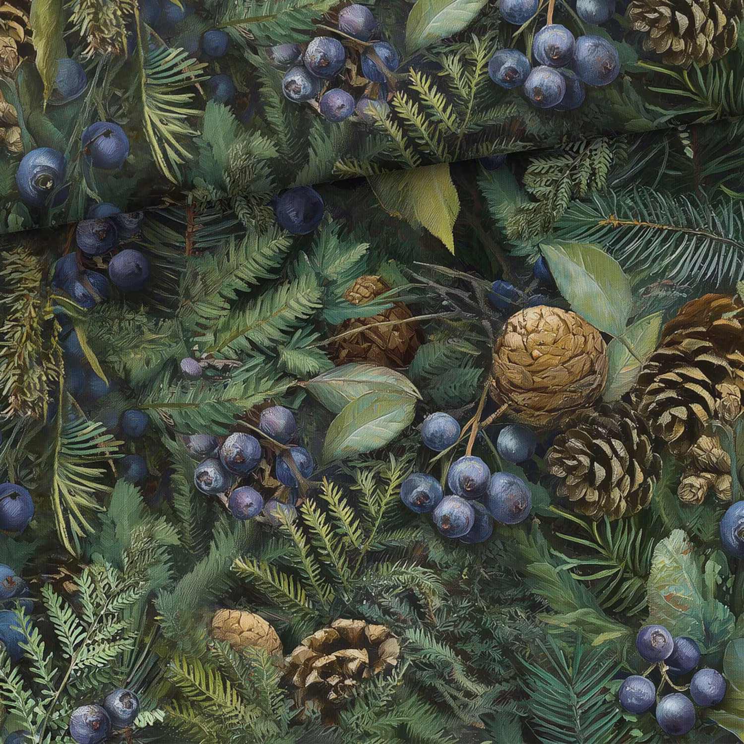 Ett mjukt, stretchigt joggingtyg med tryck av kottar, bär, barr och blad.