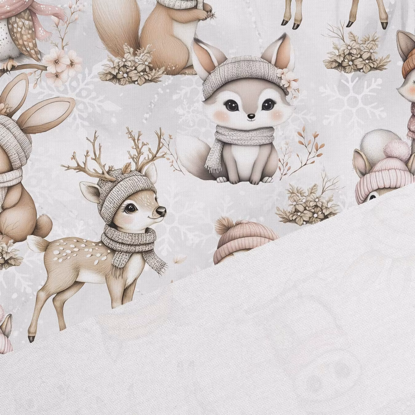 Ett mjukt, stretchigt trikåtyg med tryck av söta skogsdjur med mössor och halsdukar.