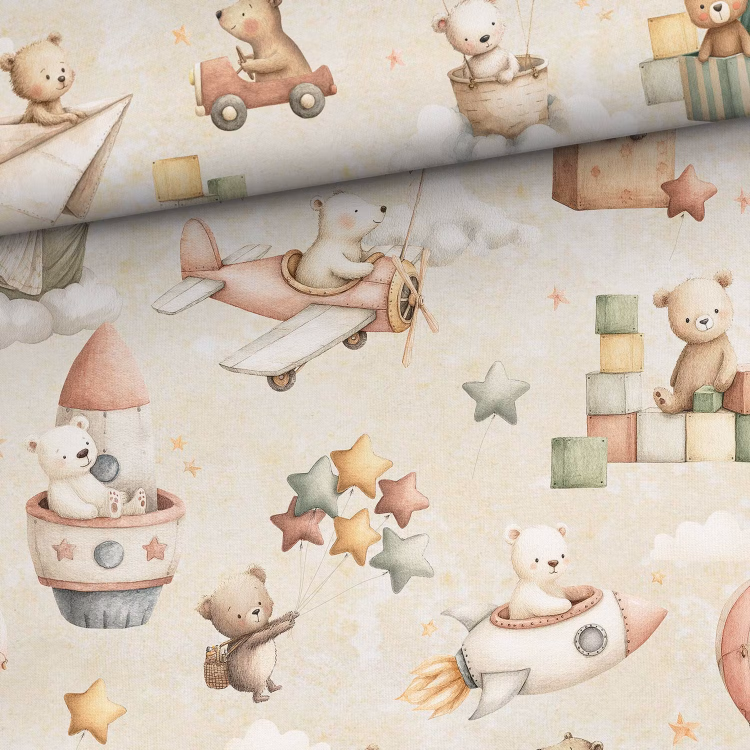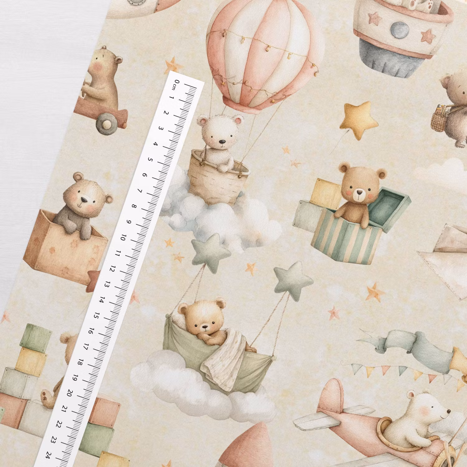 STUV 32 cm - Mjukt bomullstyg med tryck av björnar i flygplan och med ballonger. Perfekt för kläder, inredning och pyssel.