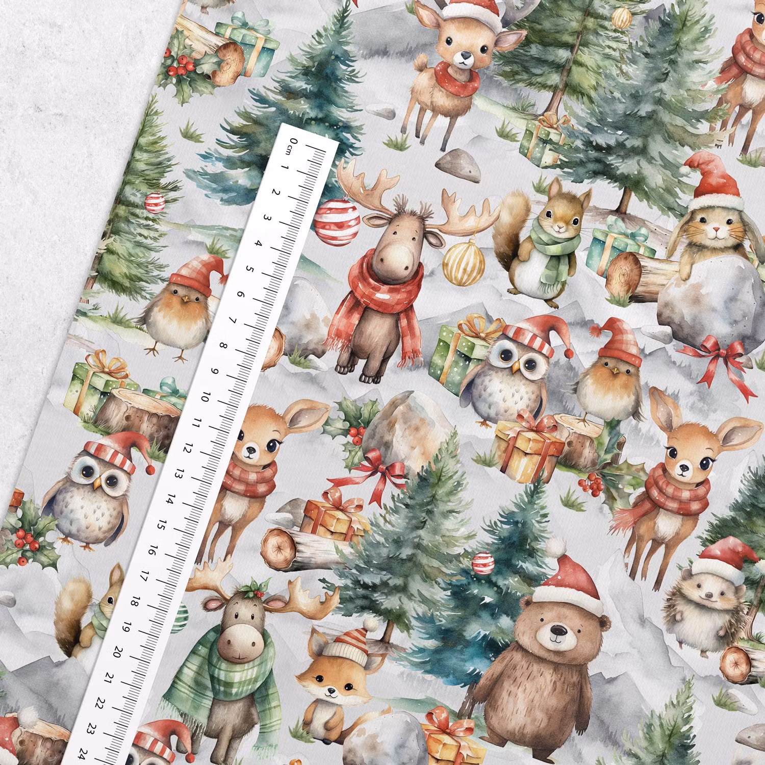 Ett mjukt, vävt bomullstyg med tryck av söta djur och julklappar.