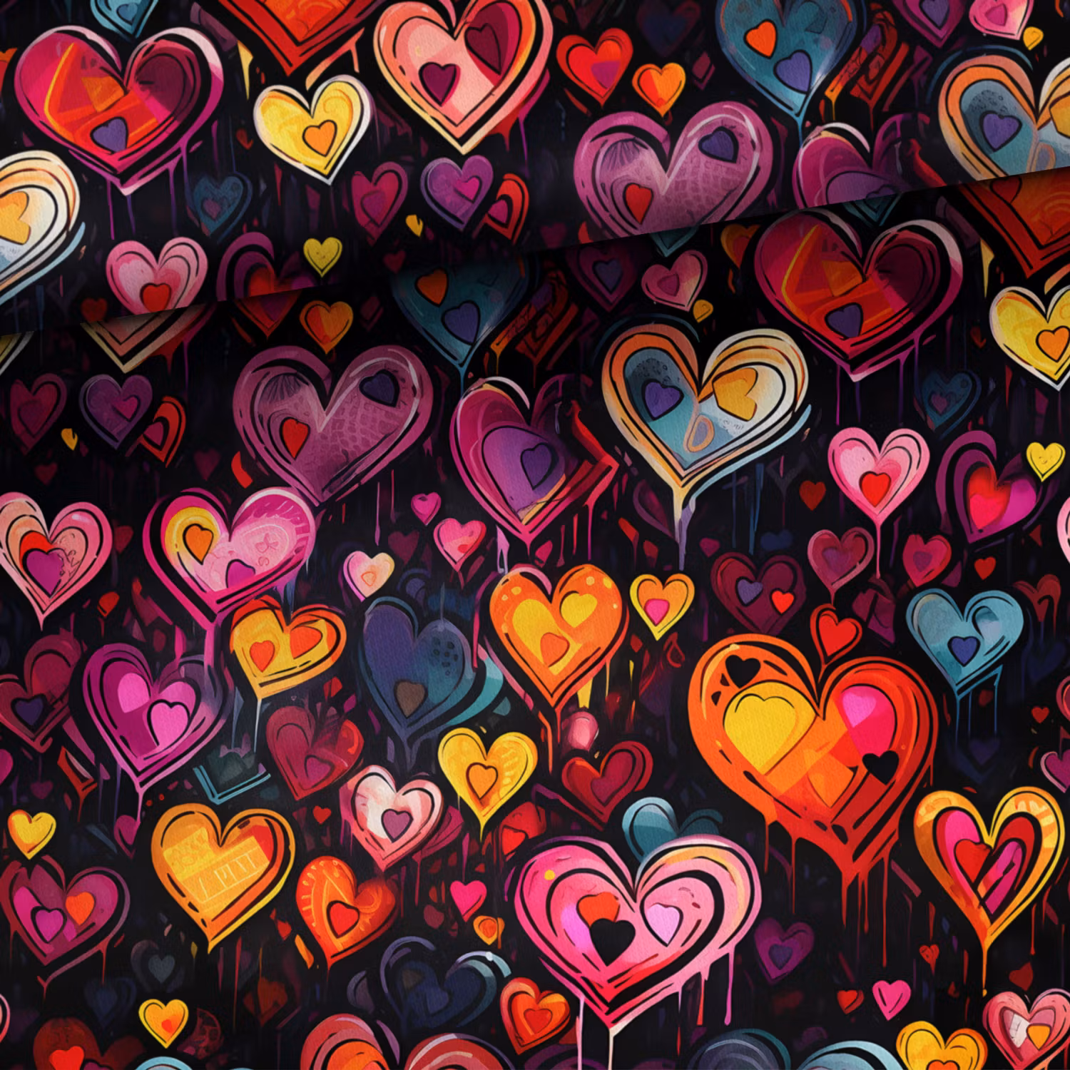 STUV 33 cm - Ett mjukt, vävt bomullstyg med tryck av färgglada hjärtan. Fint att sy påslakan, vimplar, gardiner, klänningar, kjolar och pyjamas i.