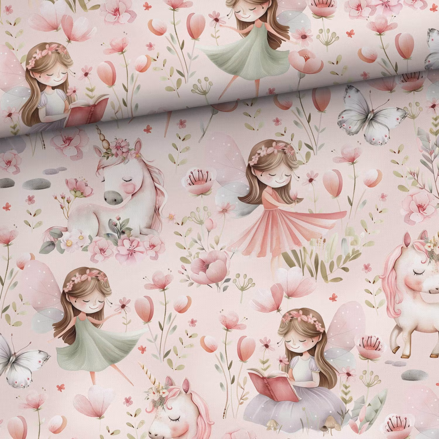 Ett mjukt, vävt bomullstyg med tryck av älvor och enhörningar med ljusrosa bakgrund.