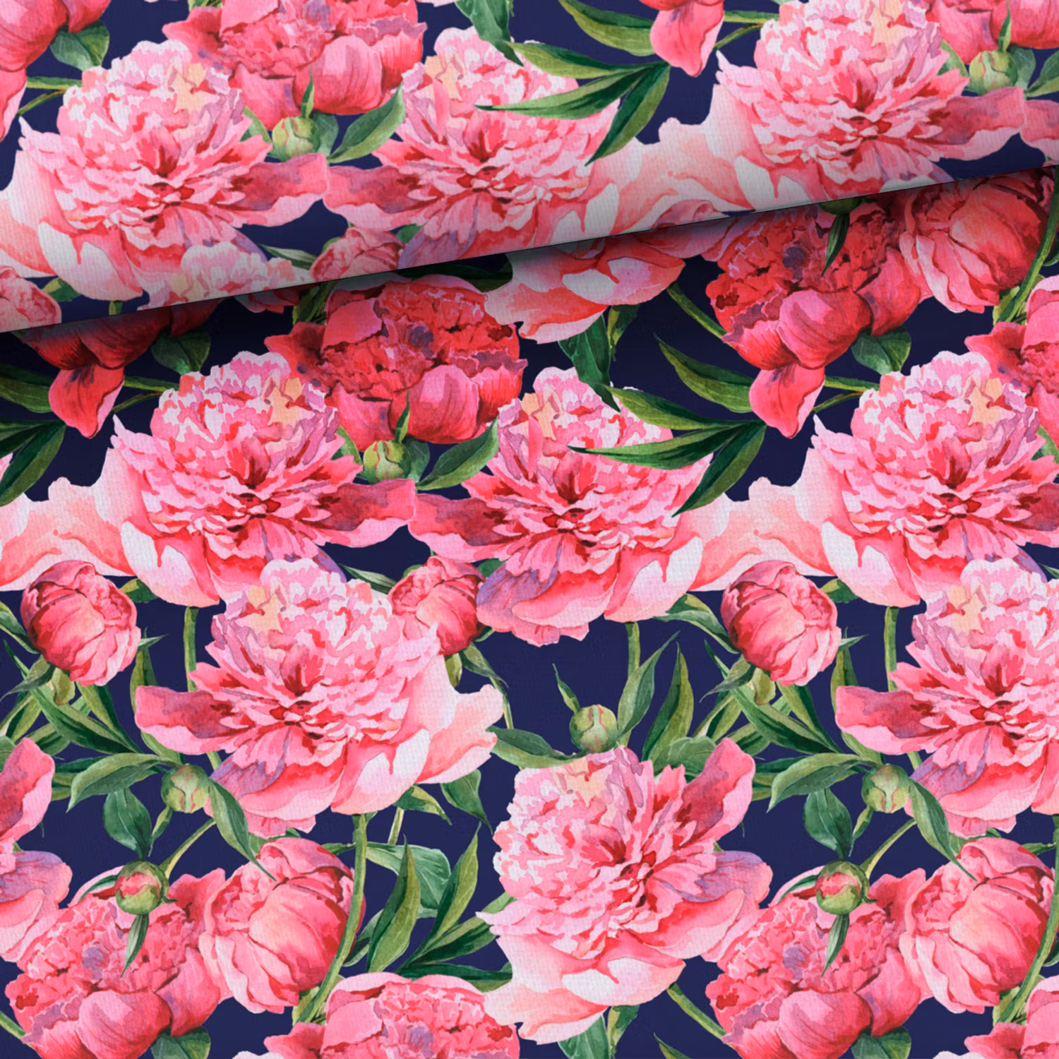 Ett mjukt, vävt bomullstyg med tryck av vackra rosa pioner på mörkblå bakgrund.
