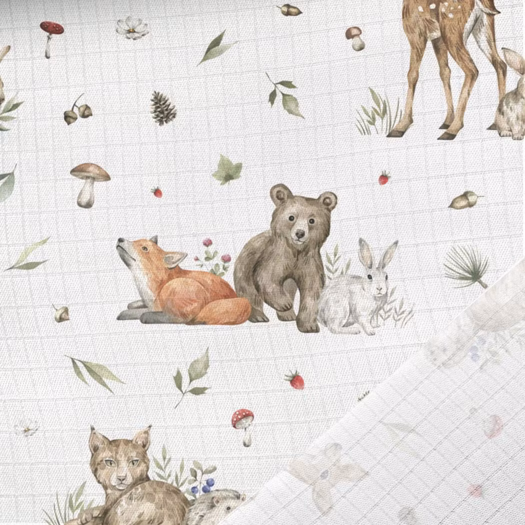 STUV 35 cm - Ett supermjukt och tunt bambutyg med tryck av skogsdjur på vit botten. Passar perfekt för sömnad av lätta babyfiltar och swaddlefiltar.