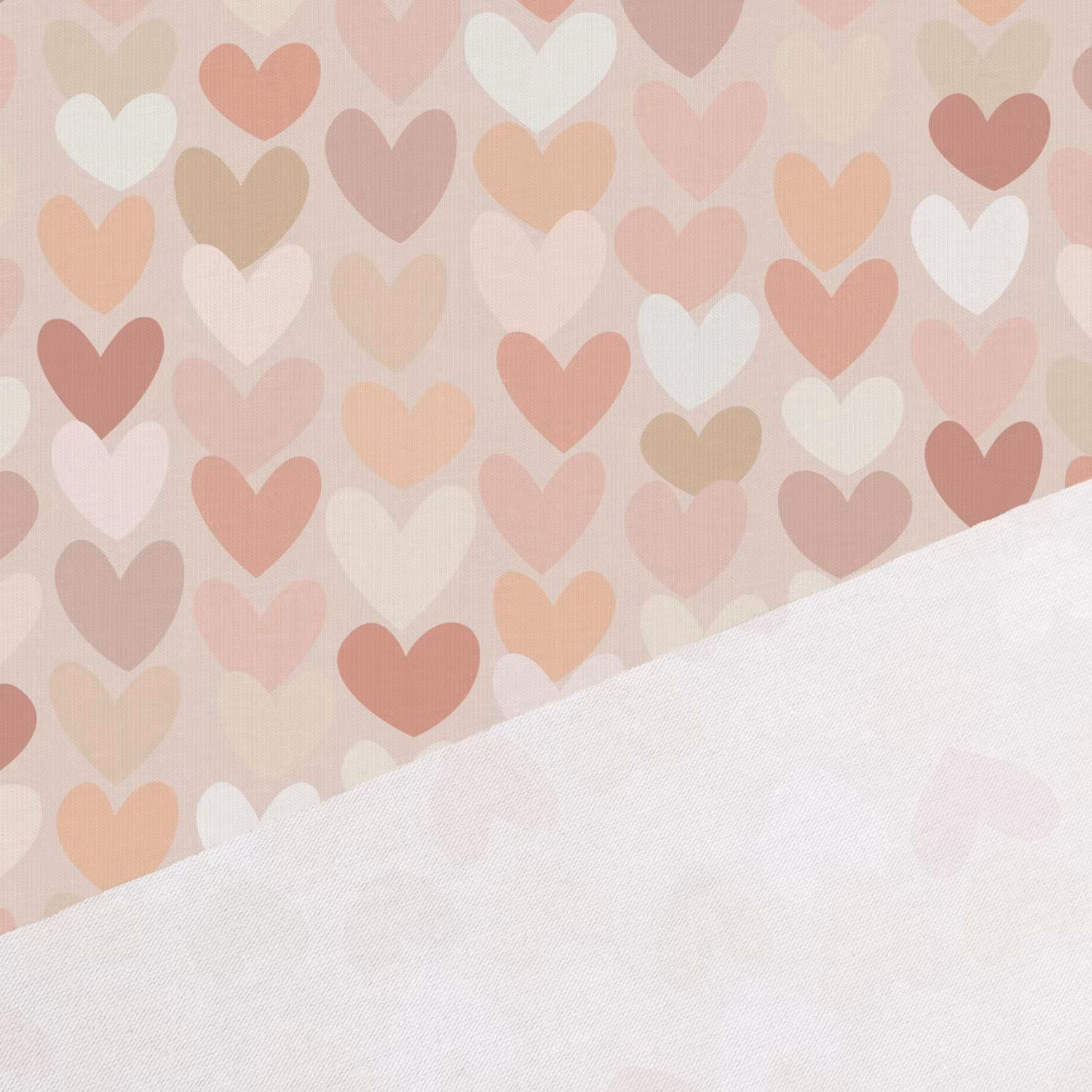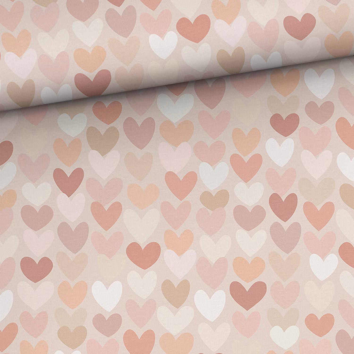 Upptäck vårt mjuka och stretchiga jerseytyg med tryck av hjärtan i ljusa nyanser - perfekt för bekväma klänningar, leggings, toppar, tunikor och pyjamasar.