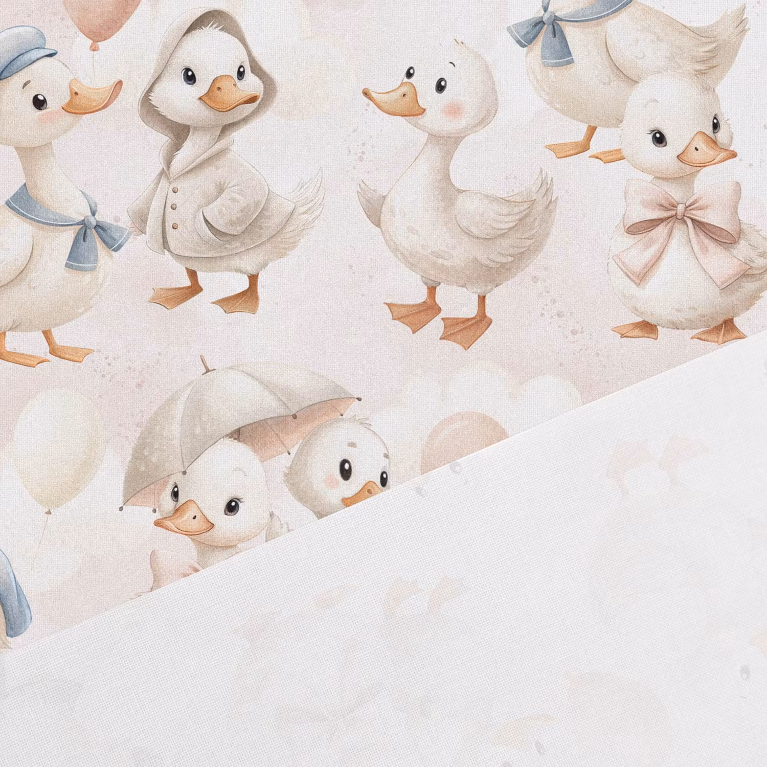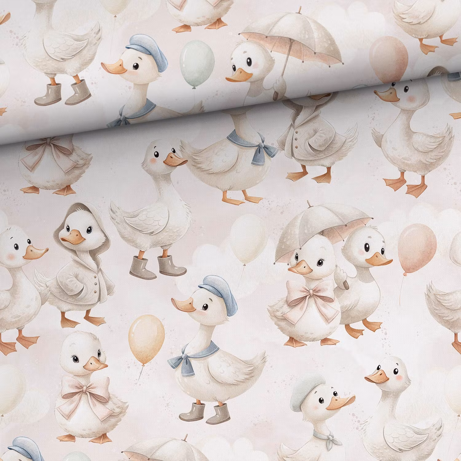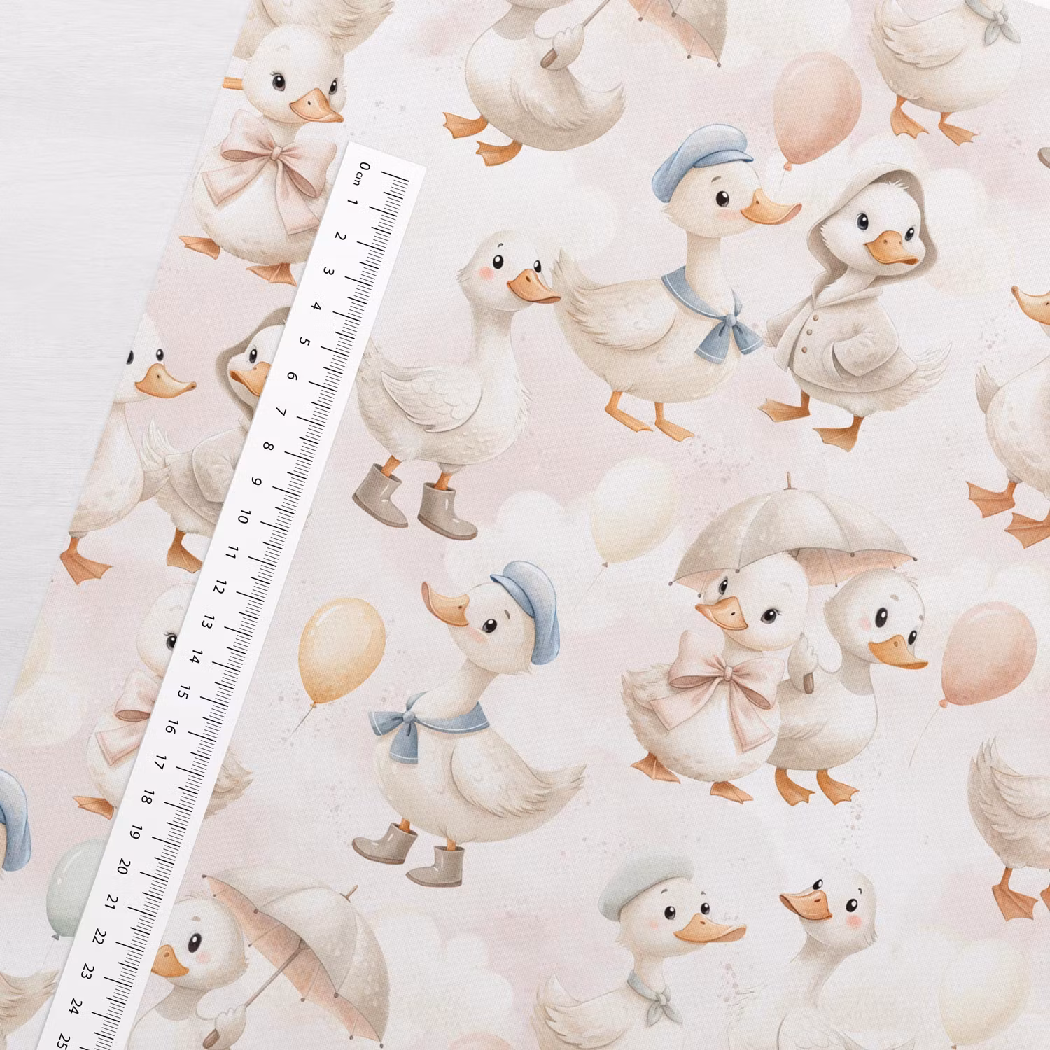 STUV 36 cm - Mjukt bomullstyg med tryck av gäss på promenad. Perfekt för kläder, inredning och pyssel. Säljs per decimeter.