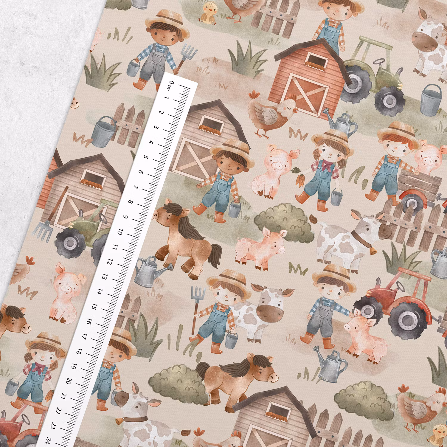 Ett mjukt, stretchigt trikåtyg med tryck av bondgårdsdjur i lugna toner.