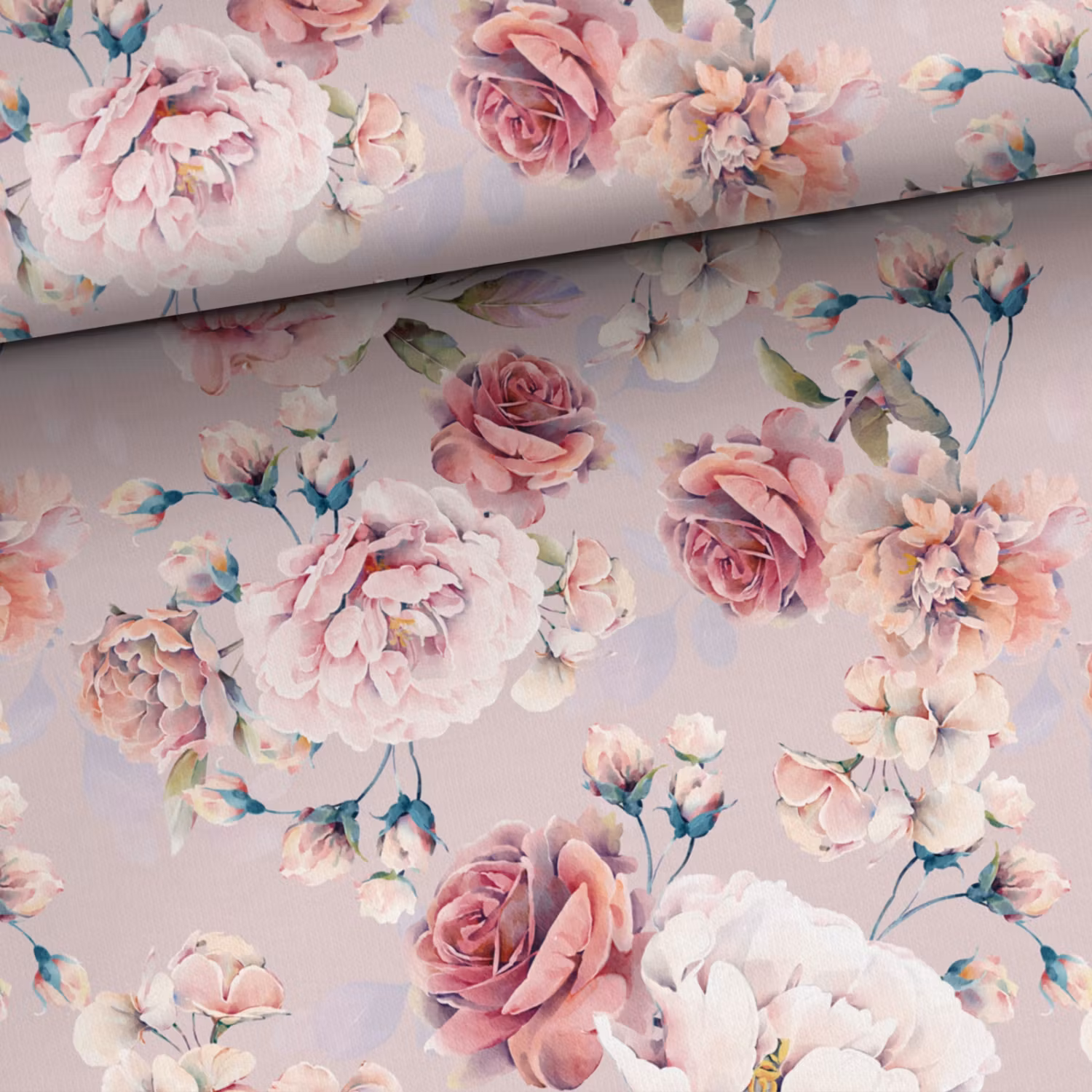 Ett mjukt, stretchigt trikåtyg med tryck av vackra blommor med gammelrosa bakgrund.